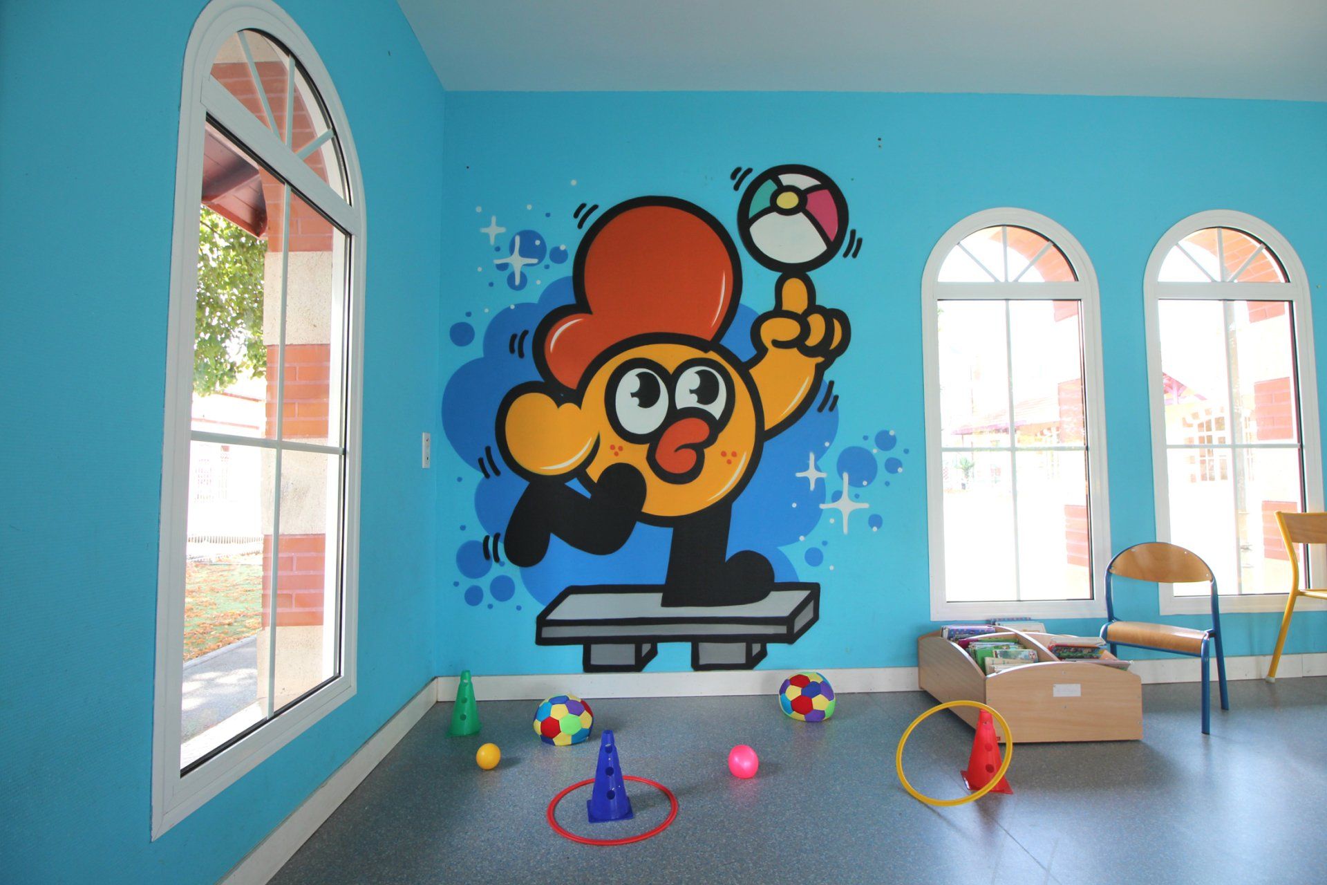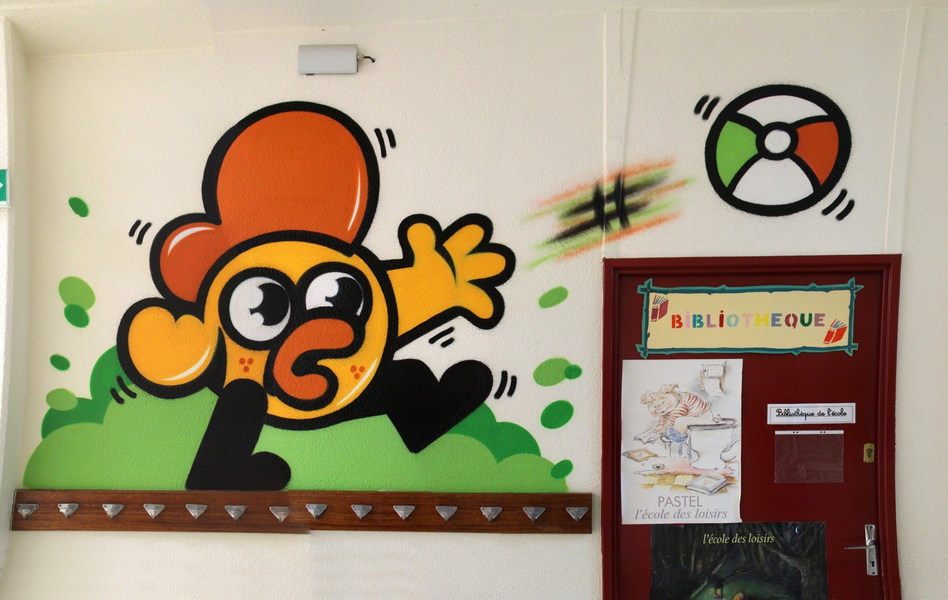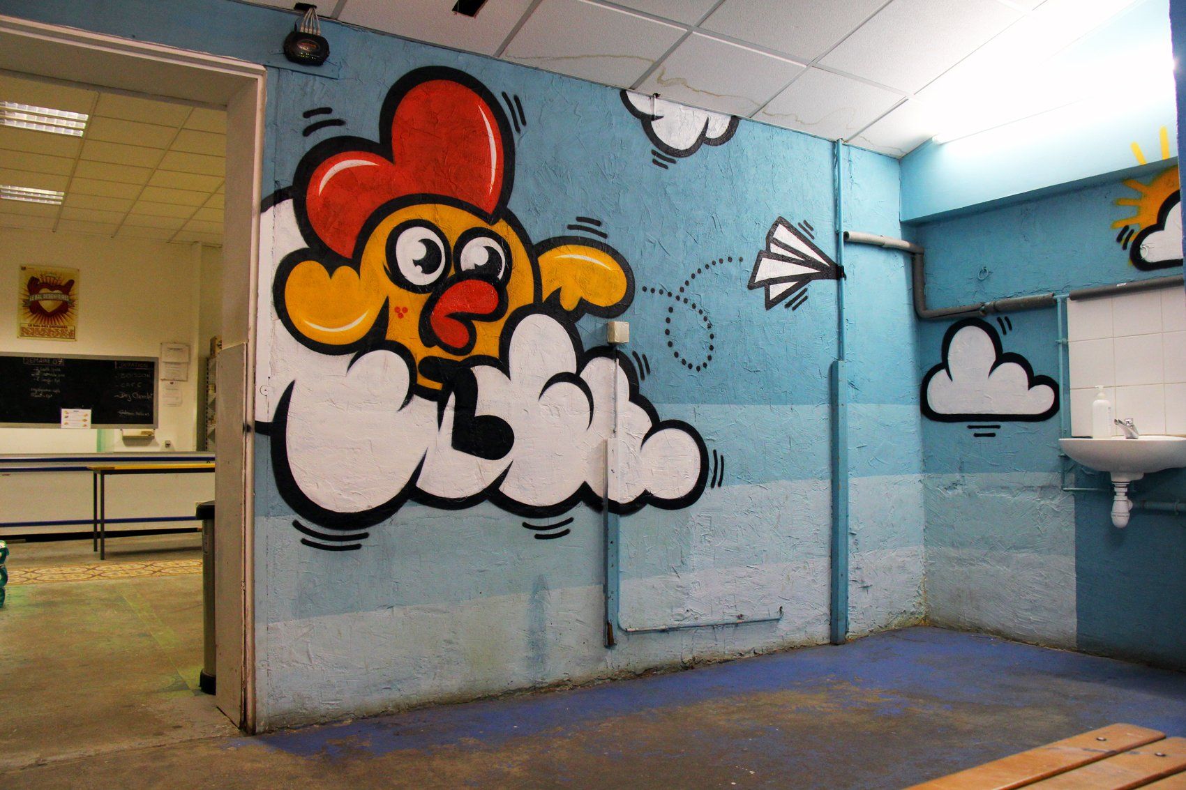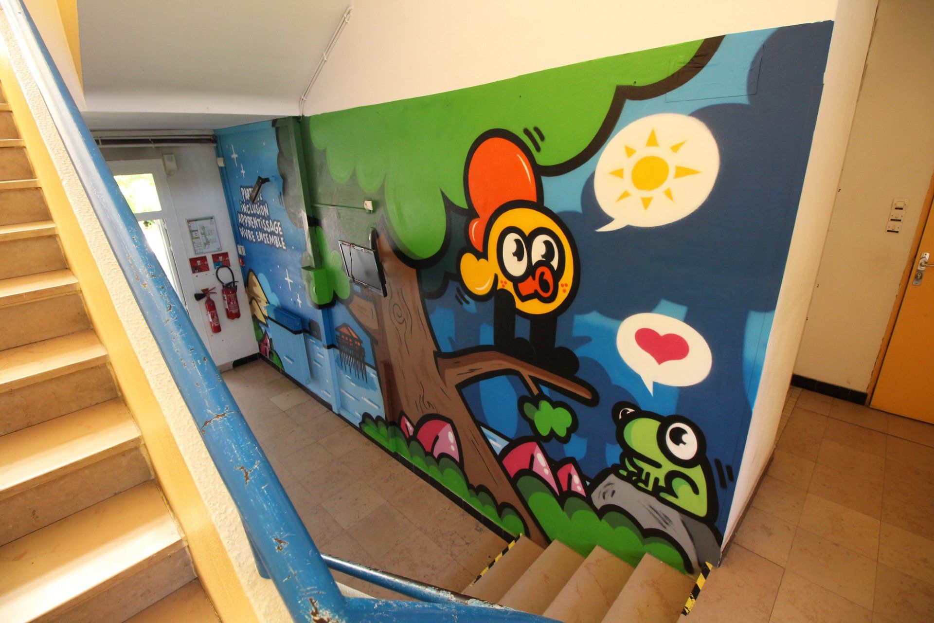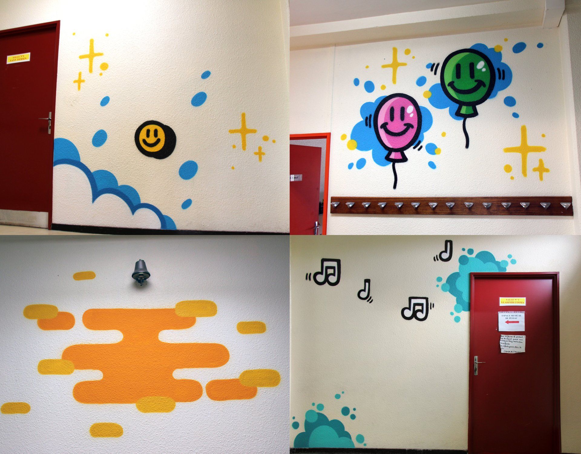 Avec mon acolyte et ami graffeur Manouch, nous avons décoré les murs blancs avec des personnages et des motifs gais et colorés. A leur retour de vacances, les enfants étaient enchantés.