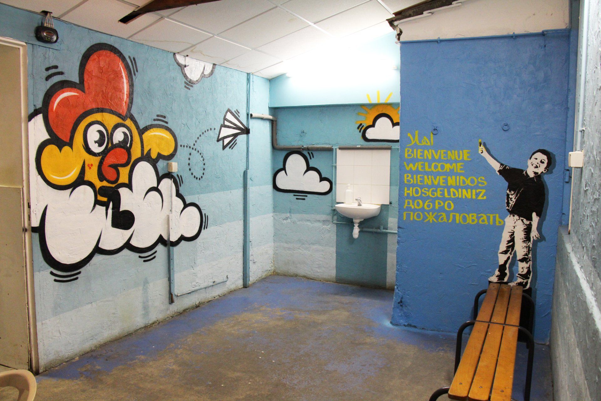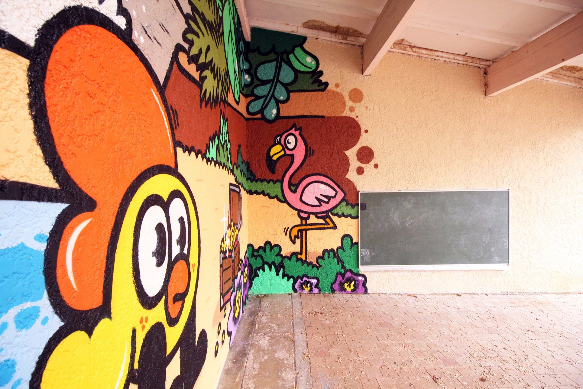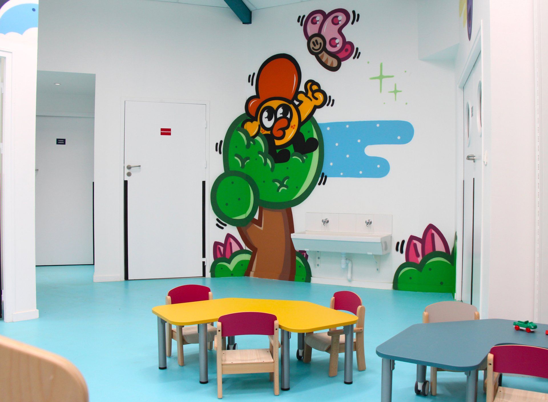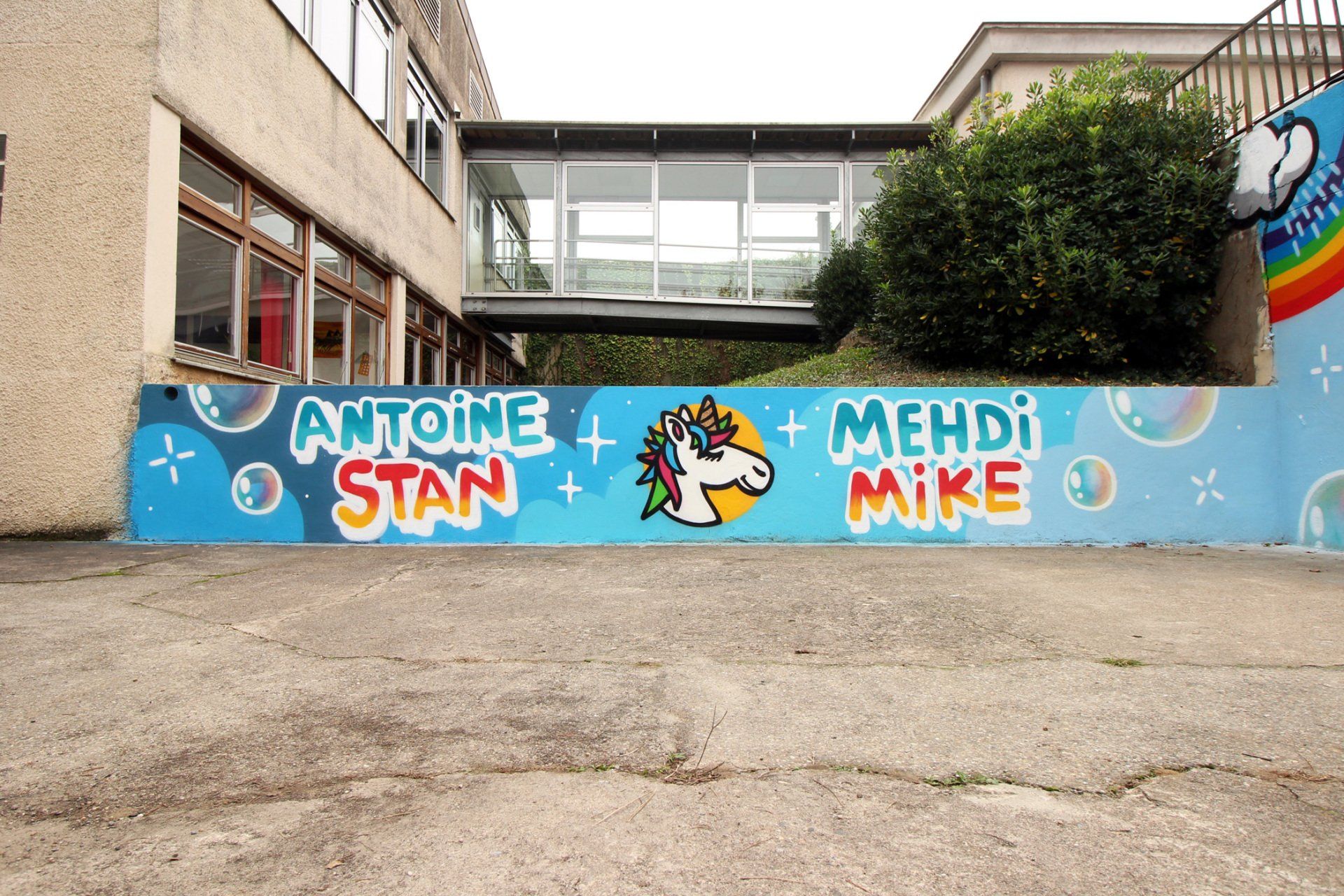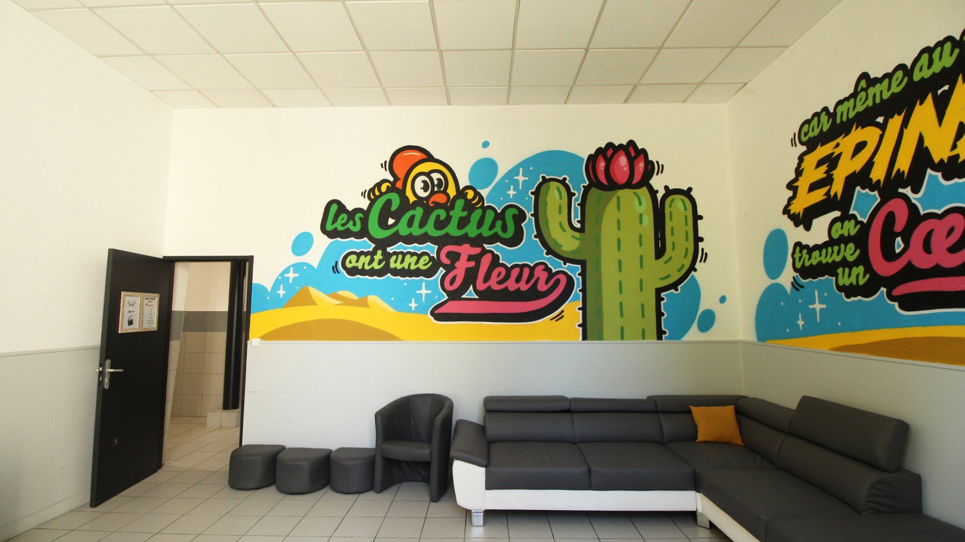 Avec mon acolyte et ami graffeur Manouch, nous avons décoré les murs blancs avec des personnages et des motifs gais et colorés. A leur retour de vacances, les enfants étaient enchantés.