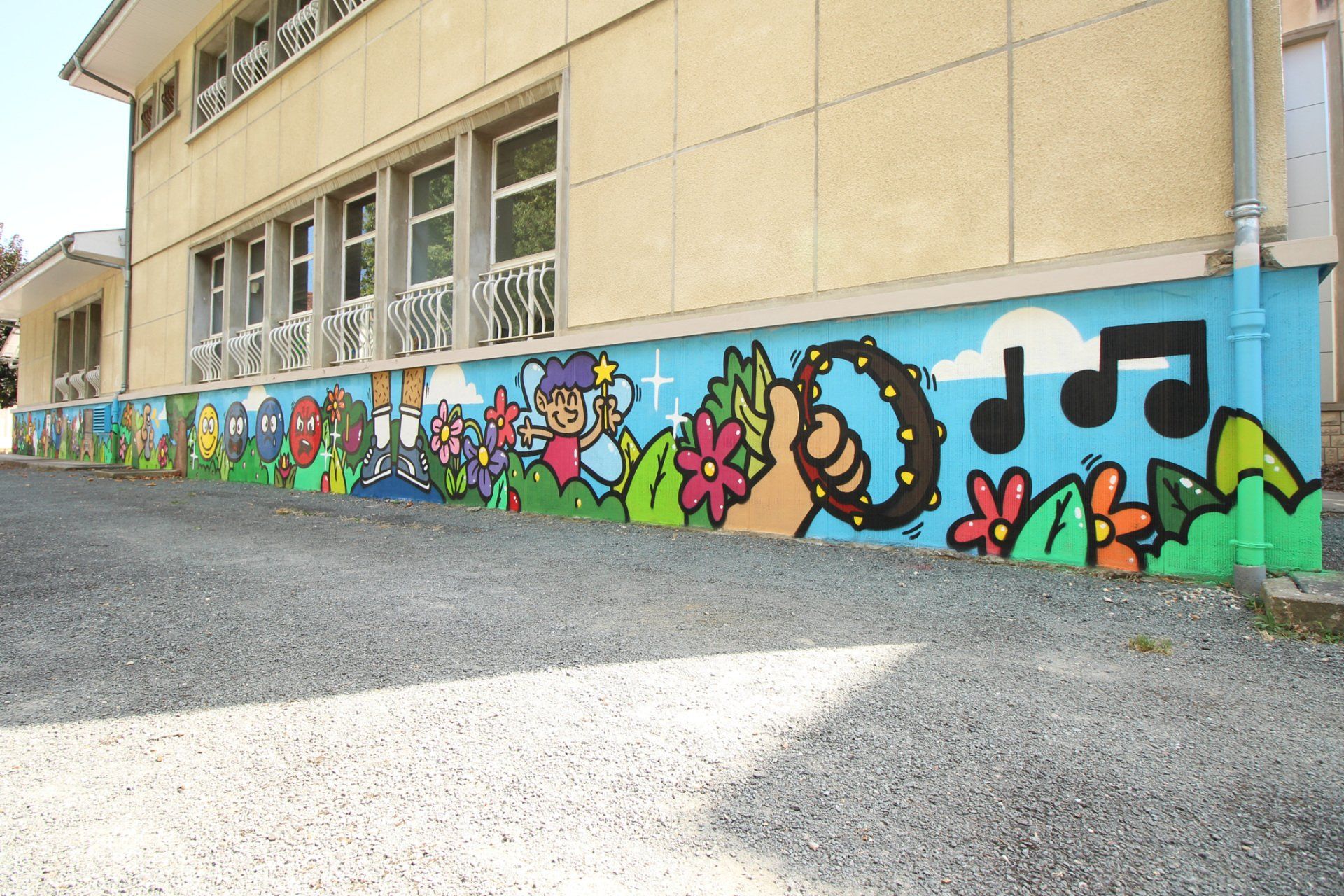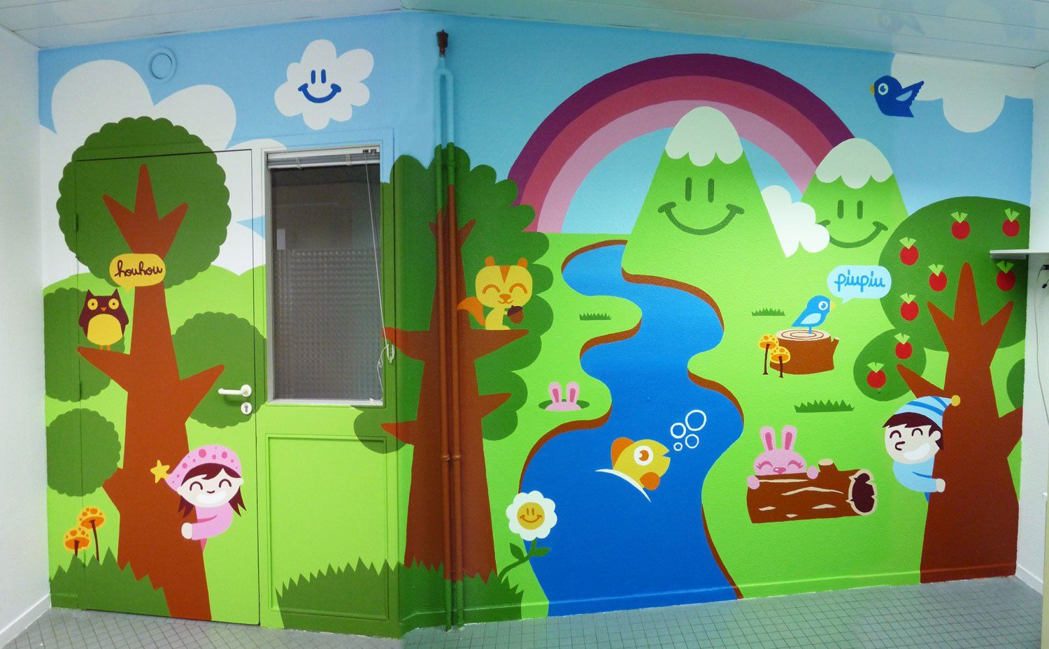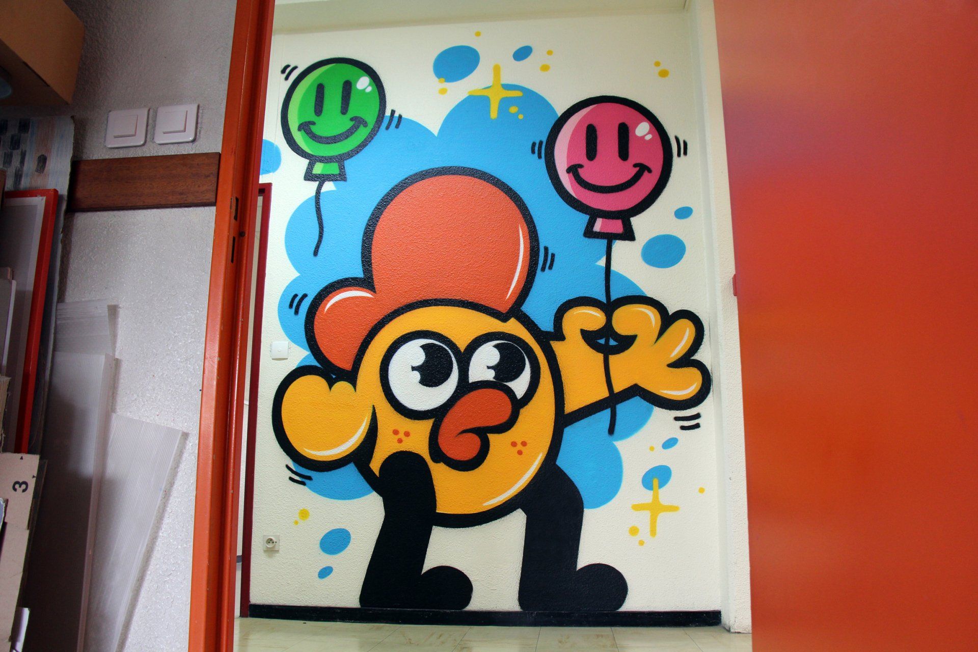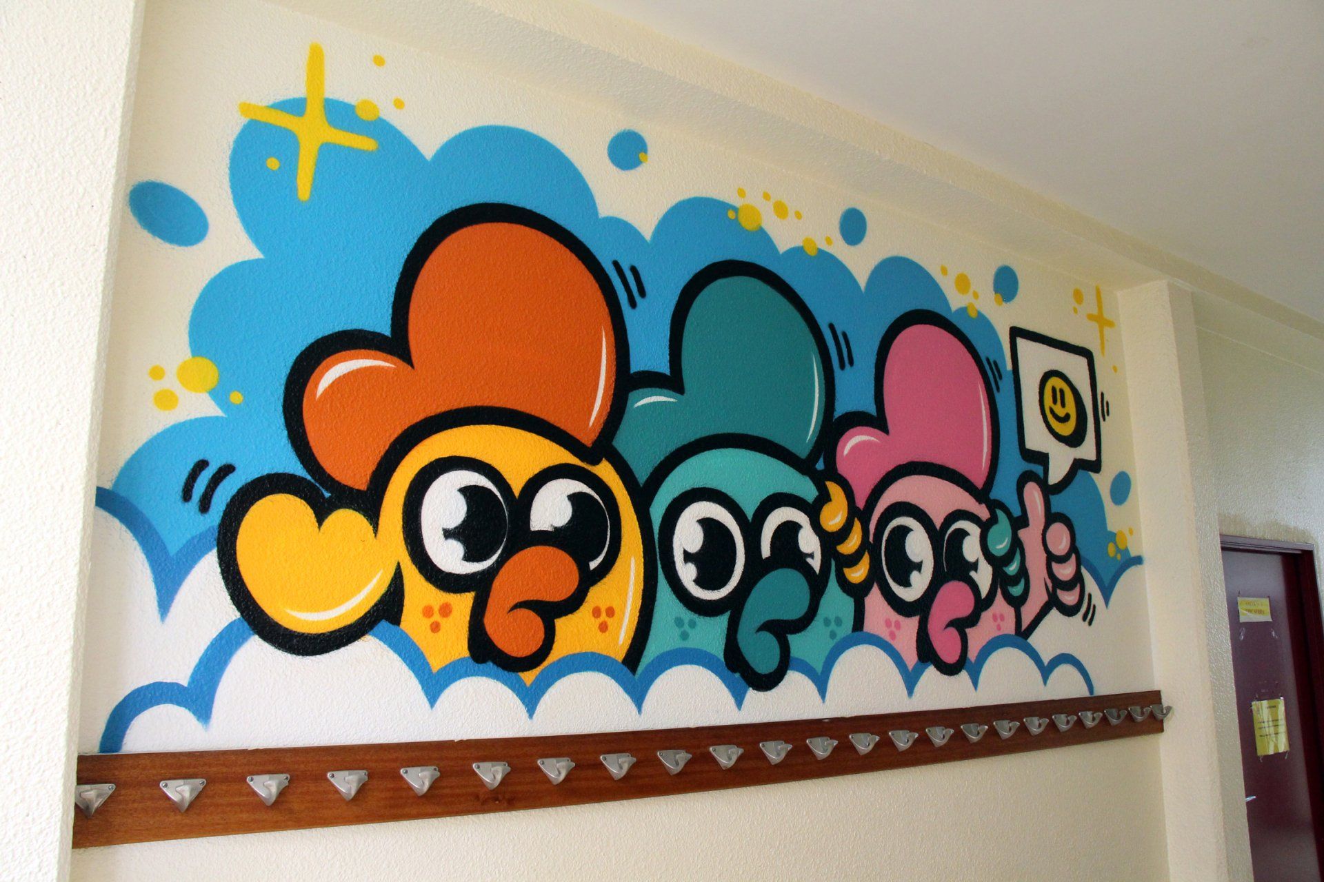 Avec mon acolyte et ami graffeur Manouch, nous avons décoré les murs blancs avec des personnages et des motifs gais et colorés. A leur retour de vacances, les enfants étaient enchantés.