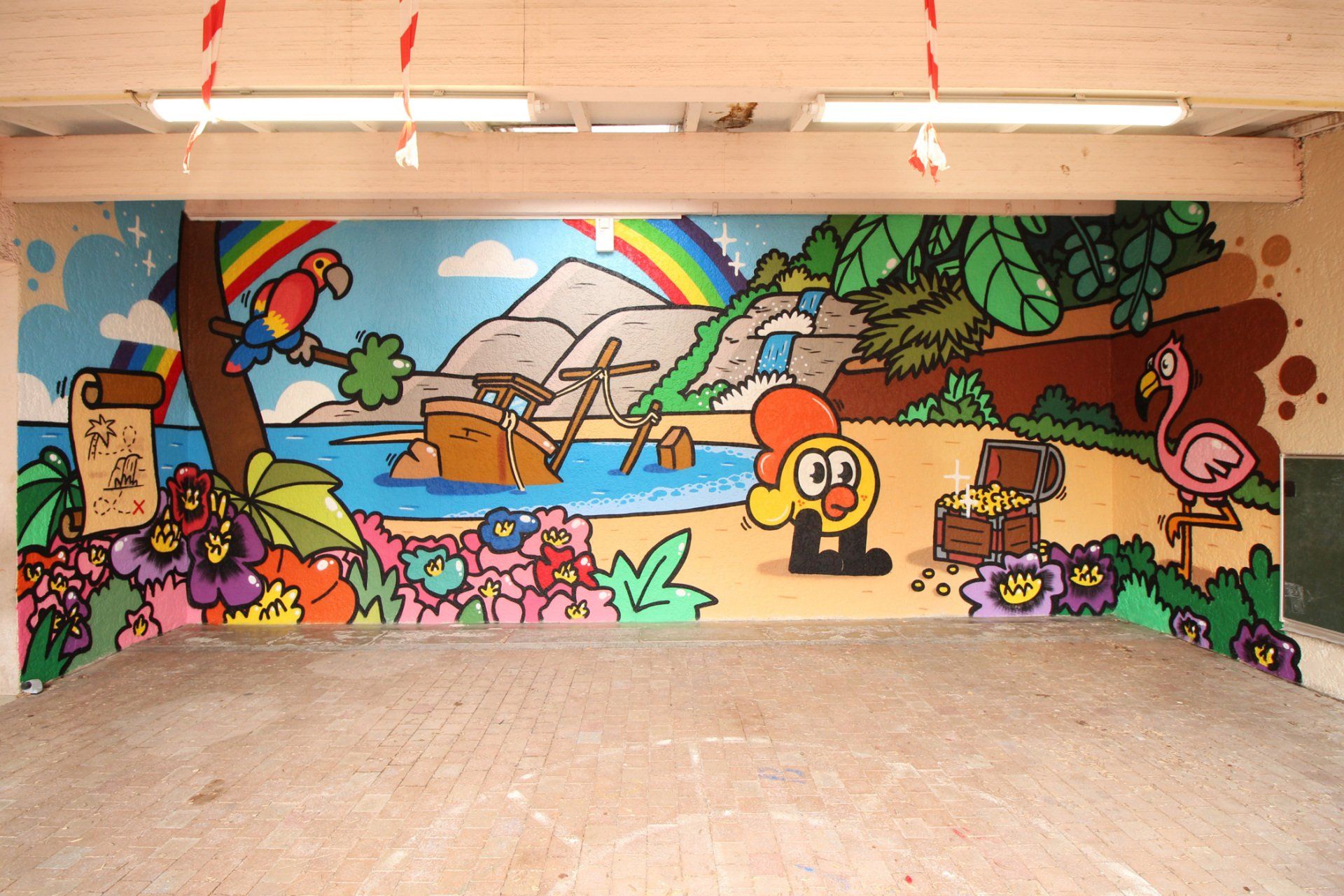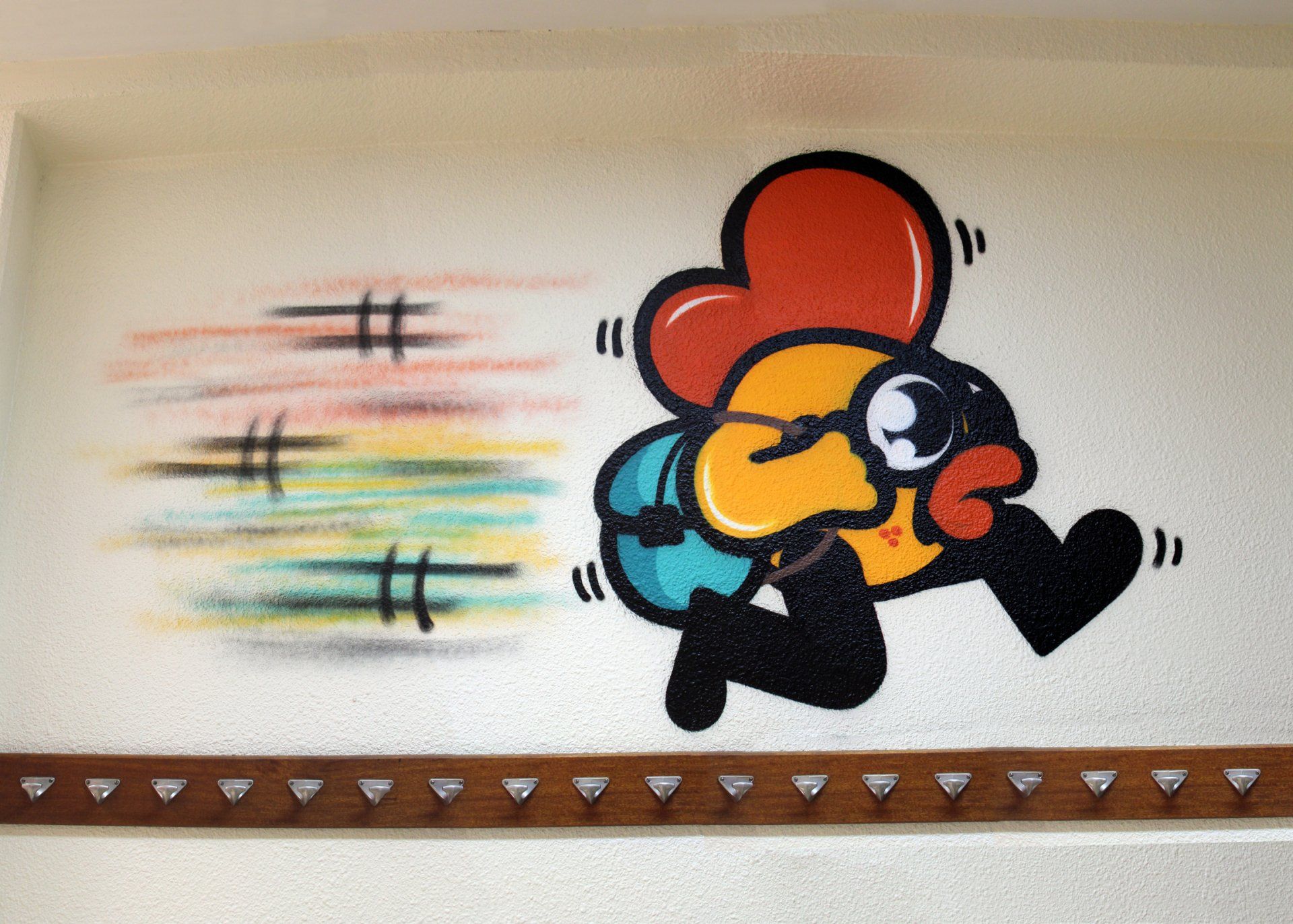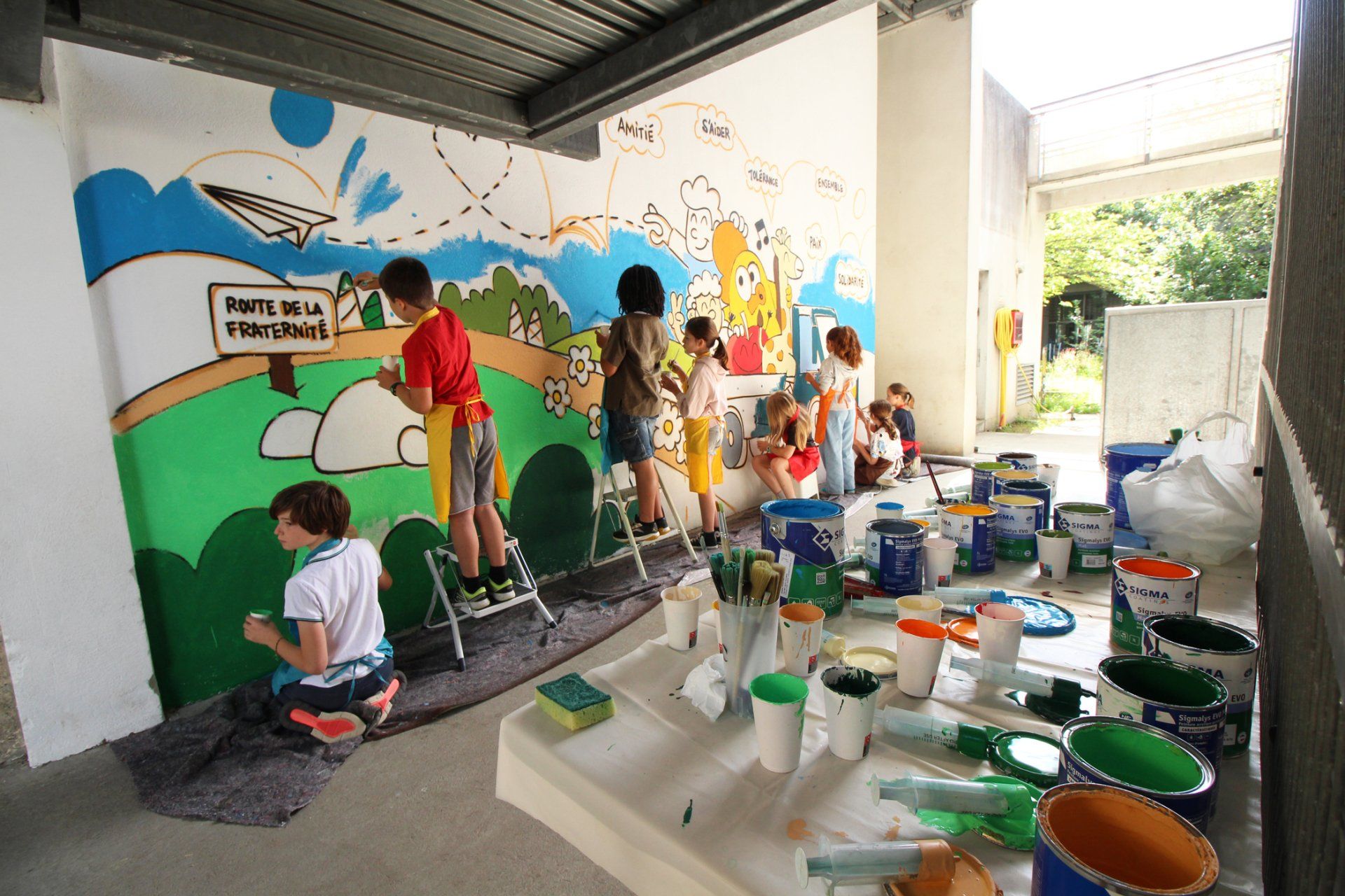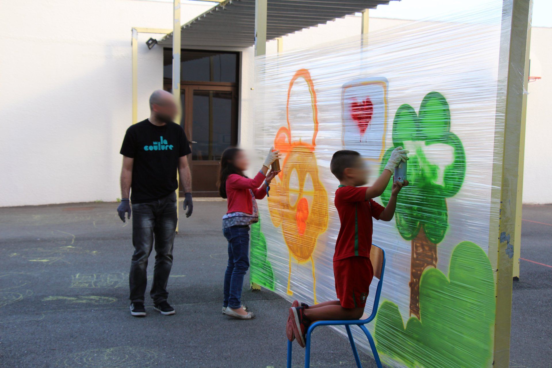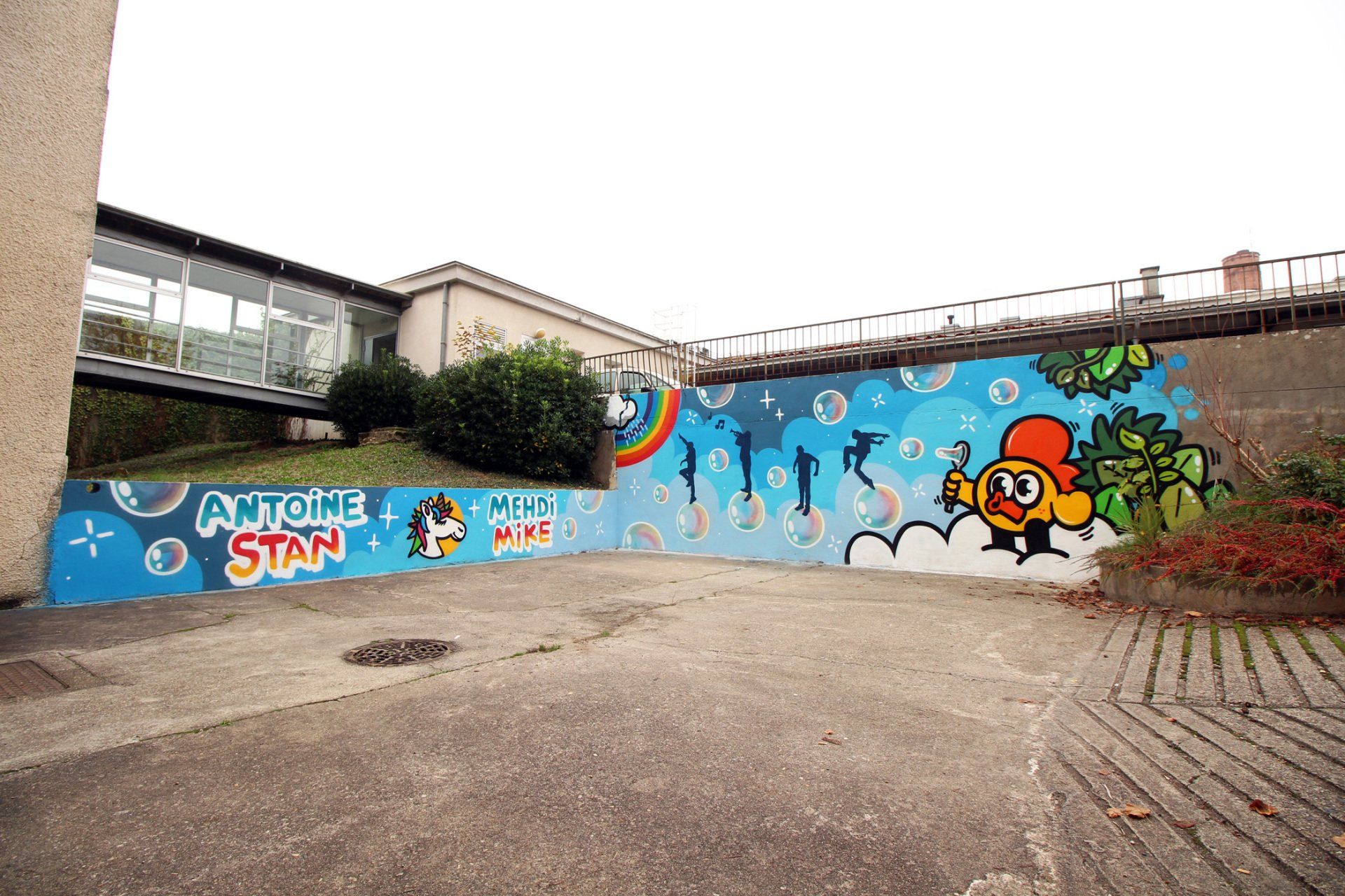 Avec mon acolyte et ami graffeur Manouch, nous avons décoré les murs blancs avec des personnages et des motifs gais et colorés. A leur retour de vacances, les enfants étaient enchantés.