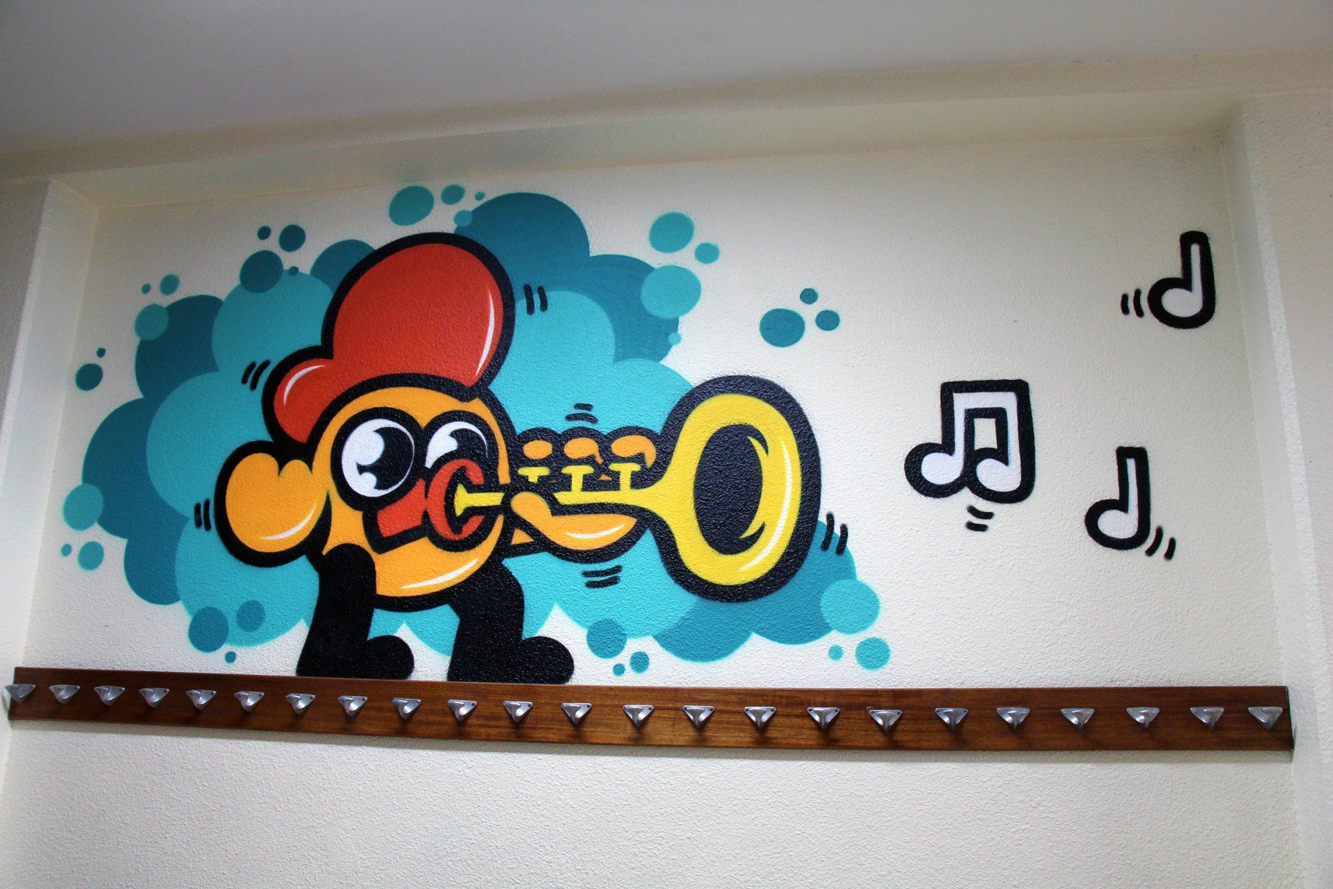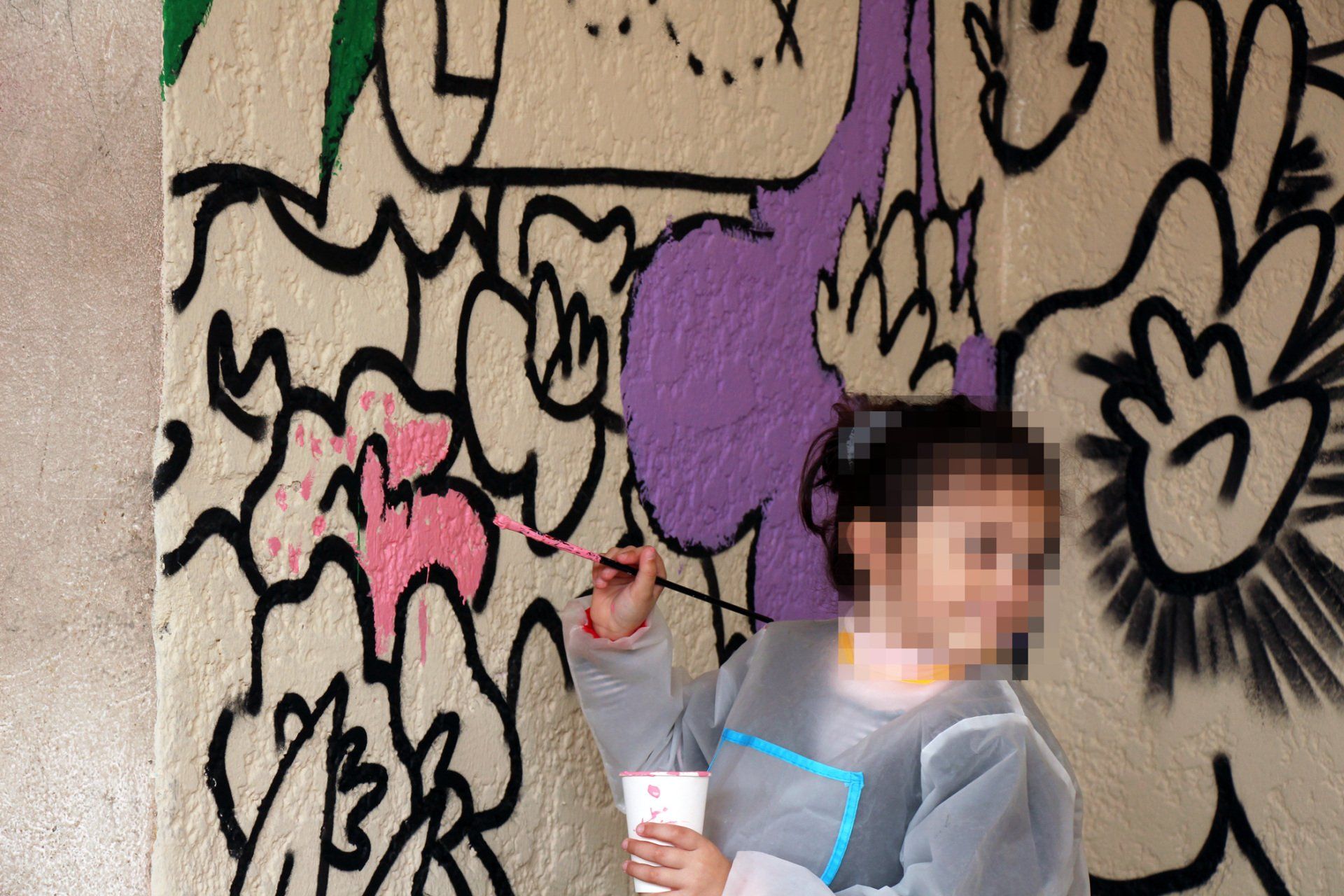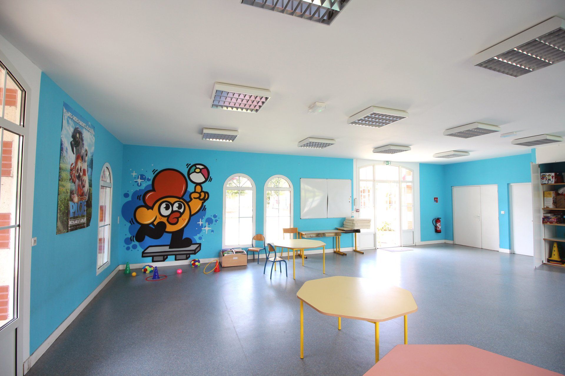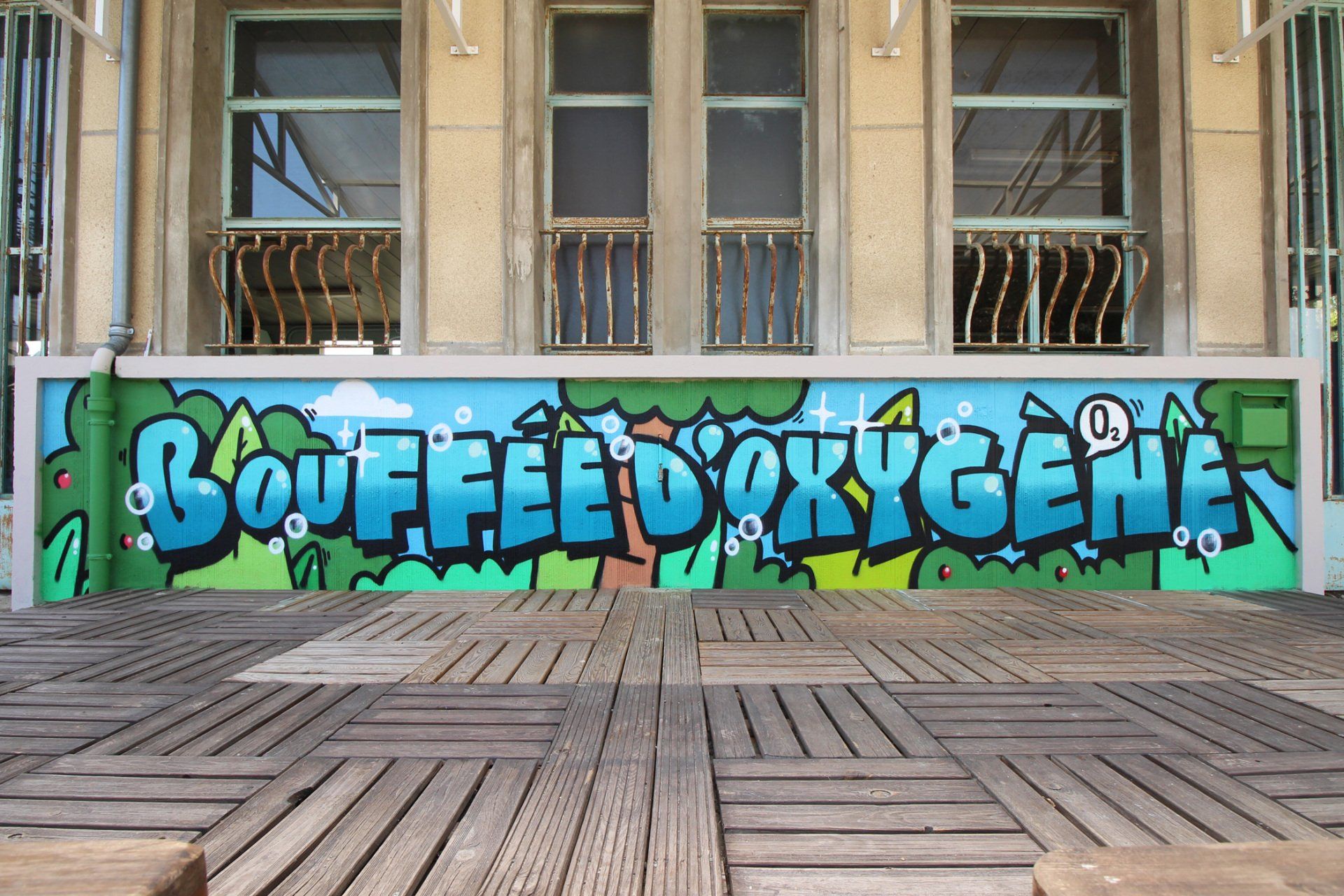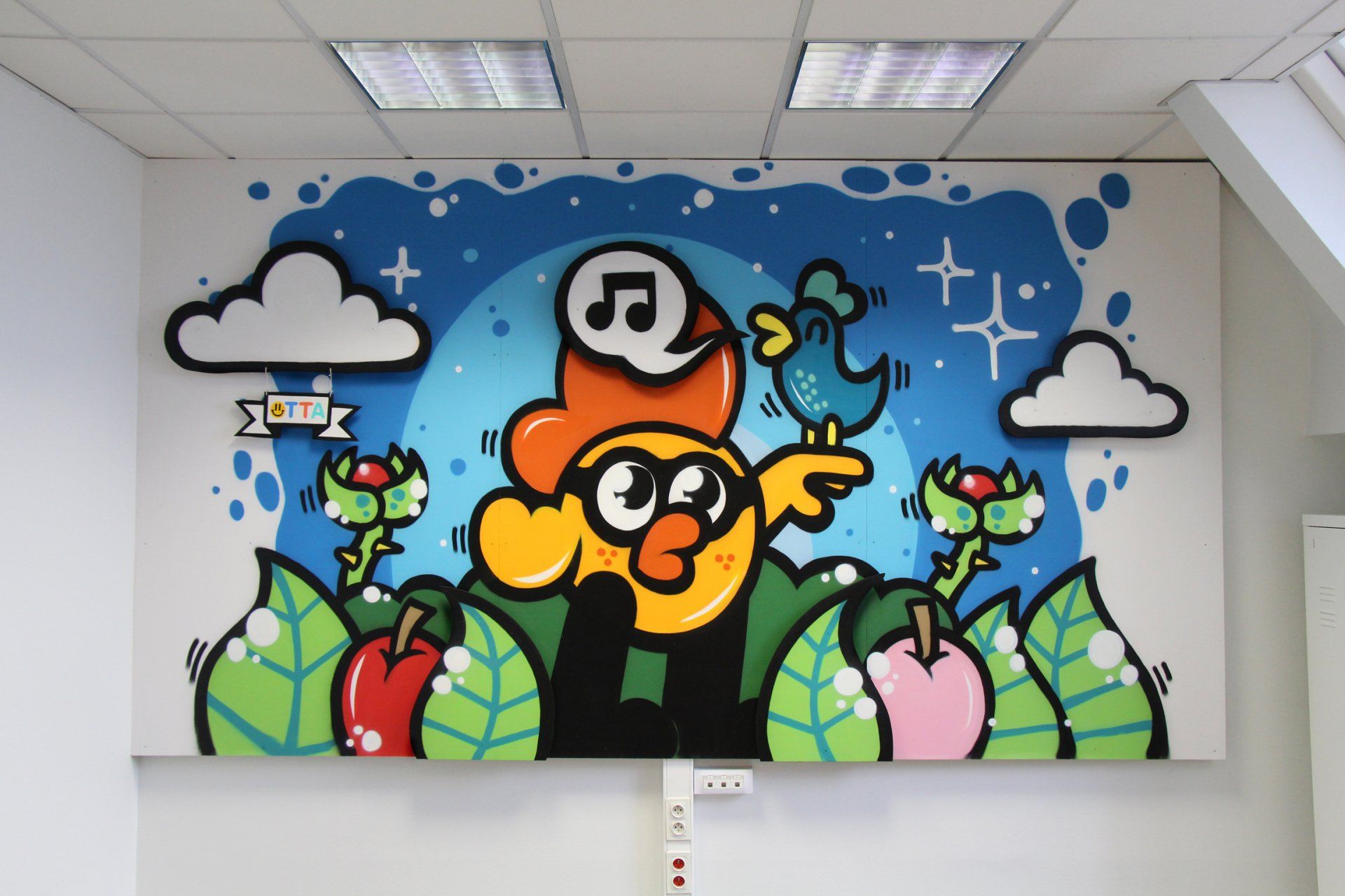 Avec mon acolyte et ami graffeur Manouch, nous avons décoré les murs blancs avec des personnages et des motifs gais et colorés. A leur retour de vacances, les enfants étaient enchantés.