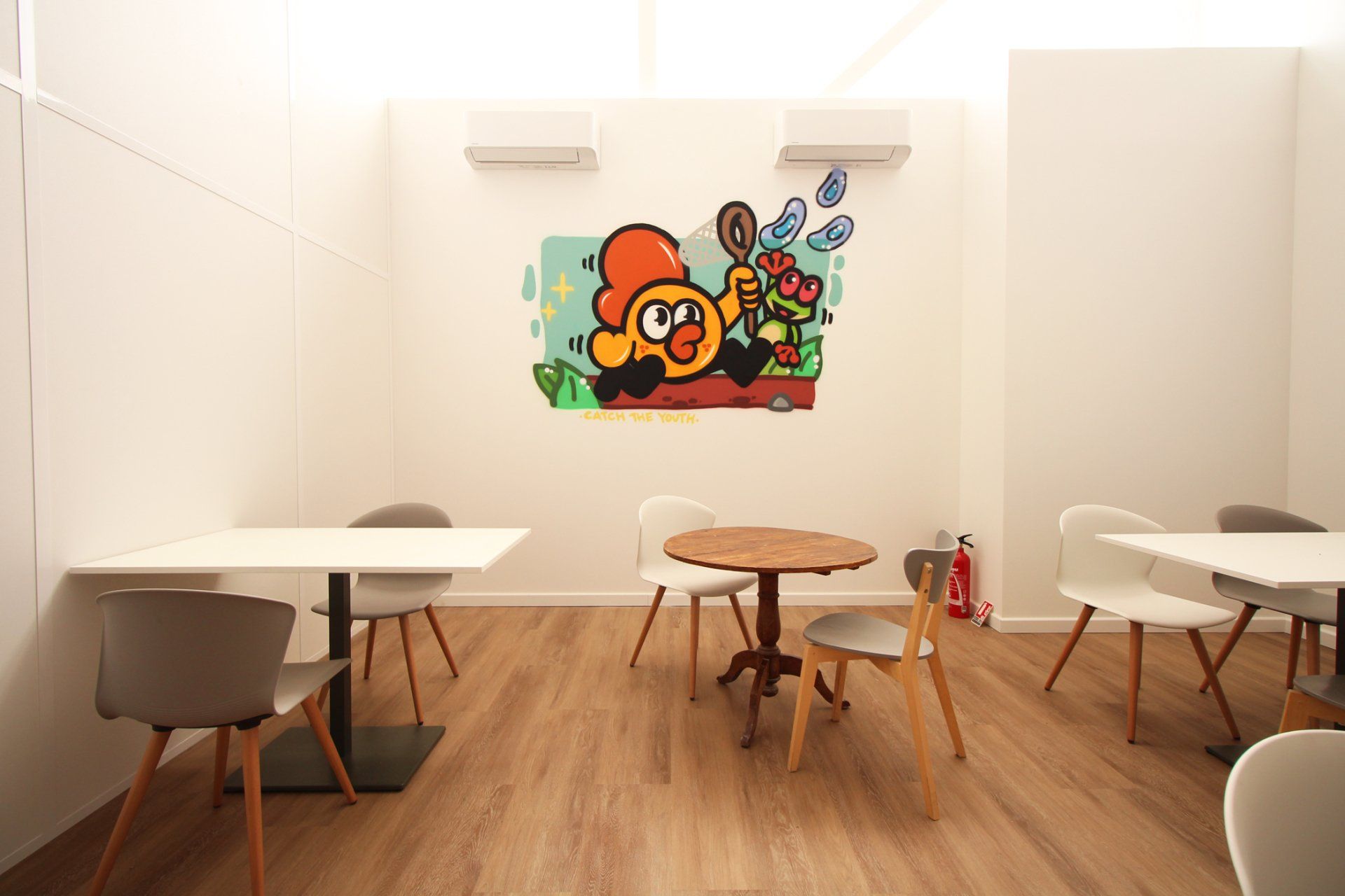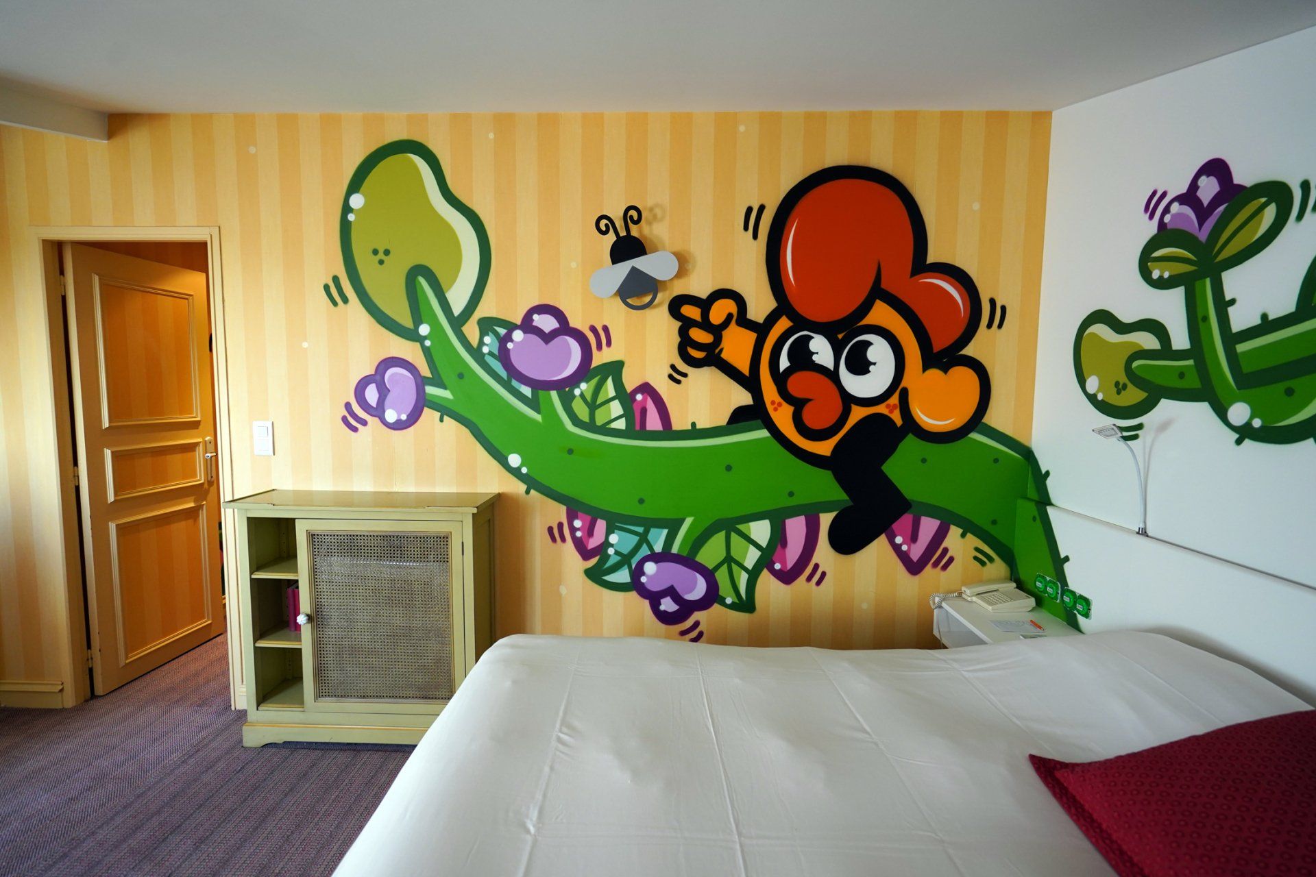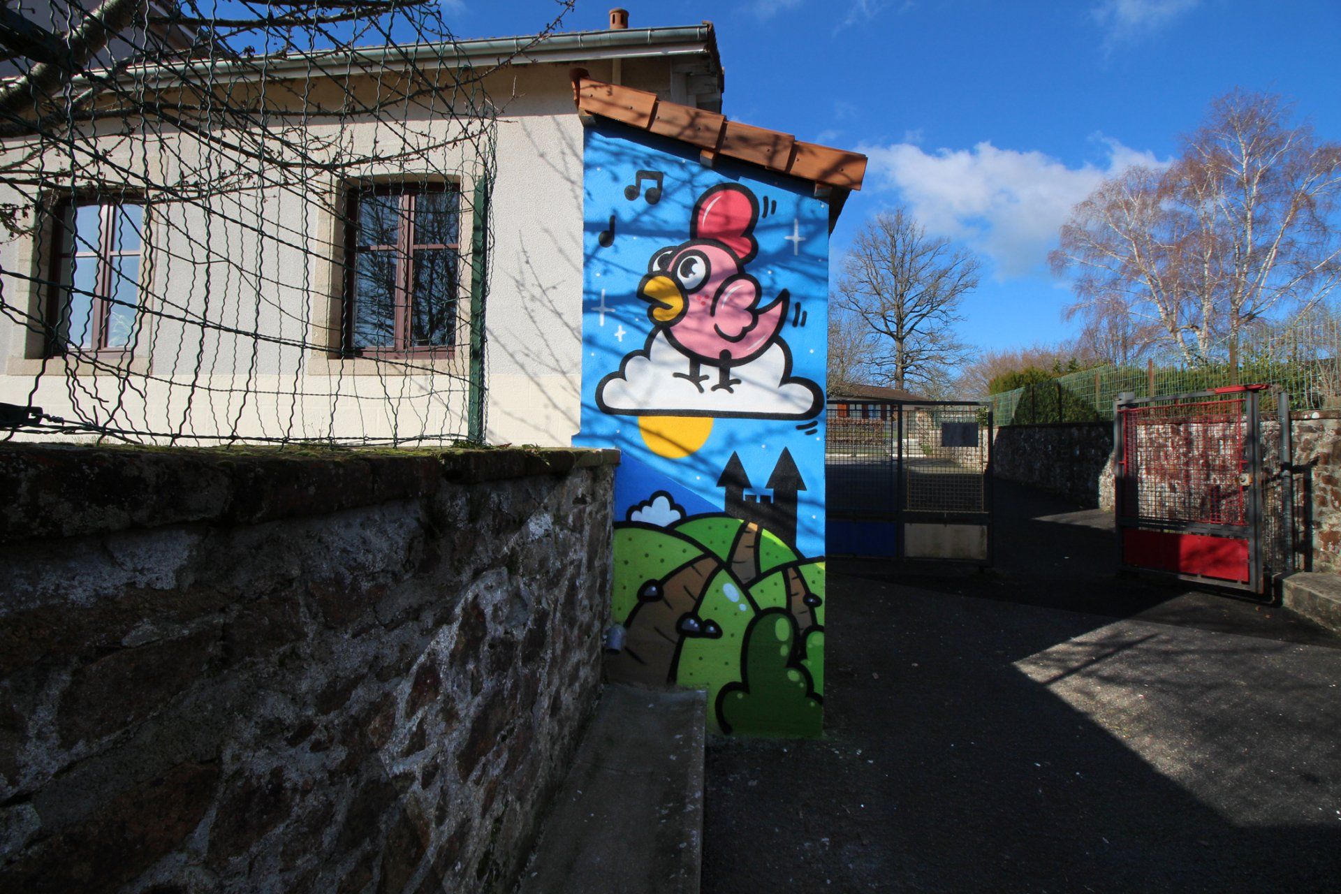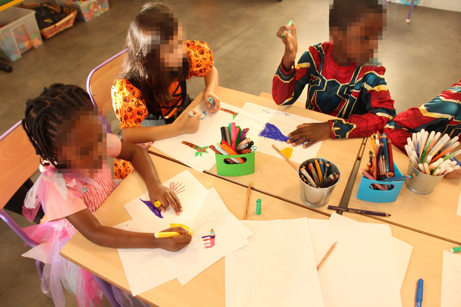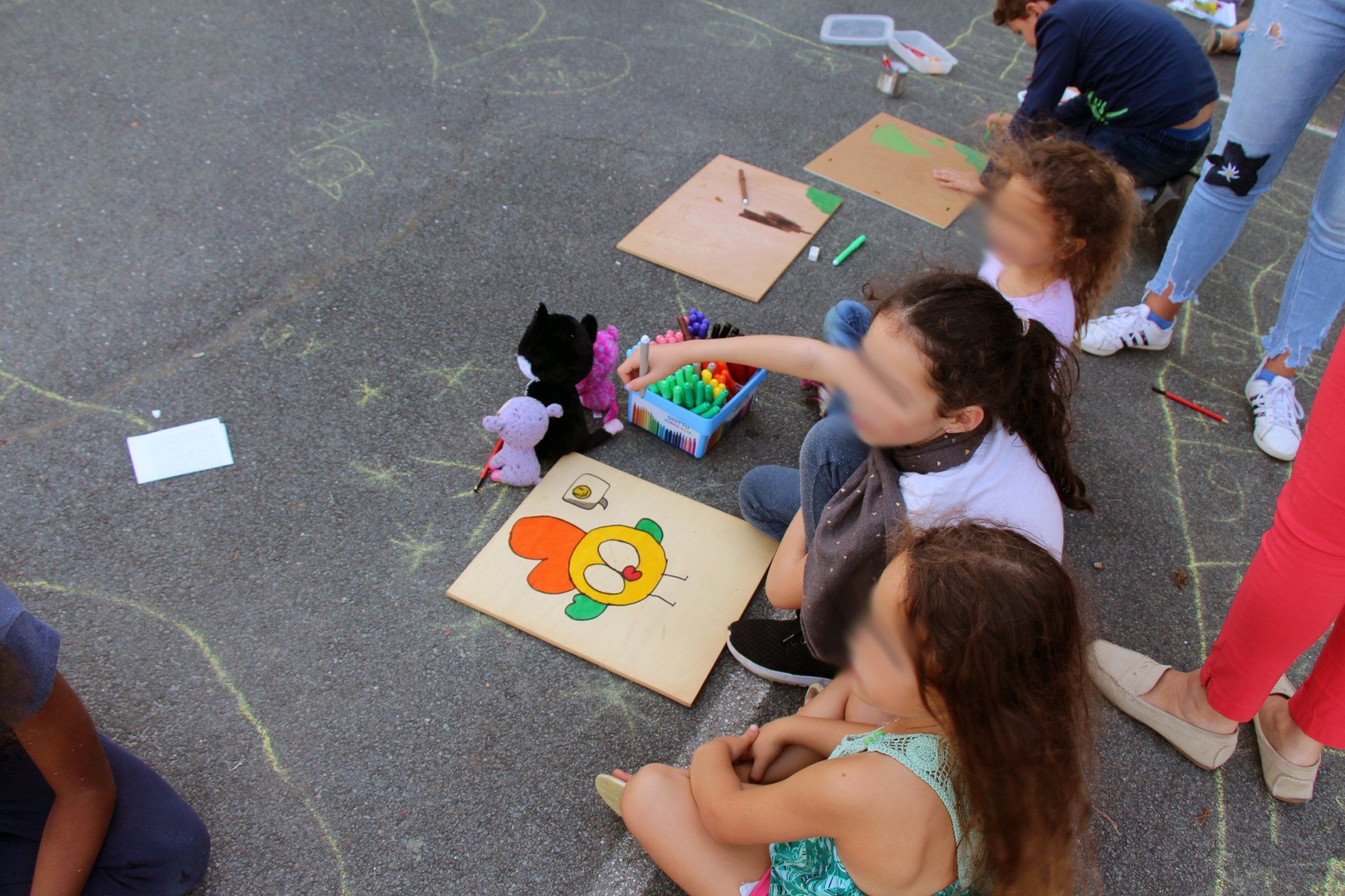 Avec mon acolyte et ami graffeur Manouch, nous avons décoré les murs blancs avec des personnages et des motifs gais et colorés. A leur retour de vacances, les enfants étaient enchantés.