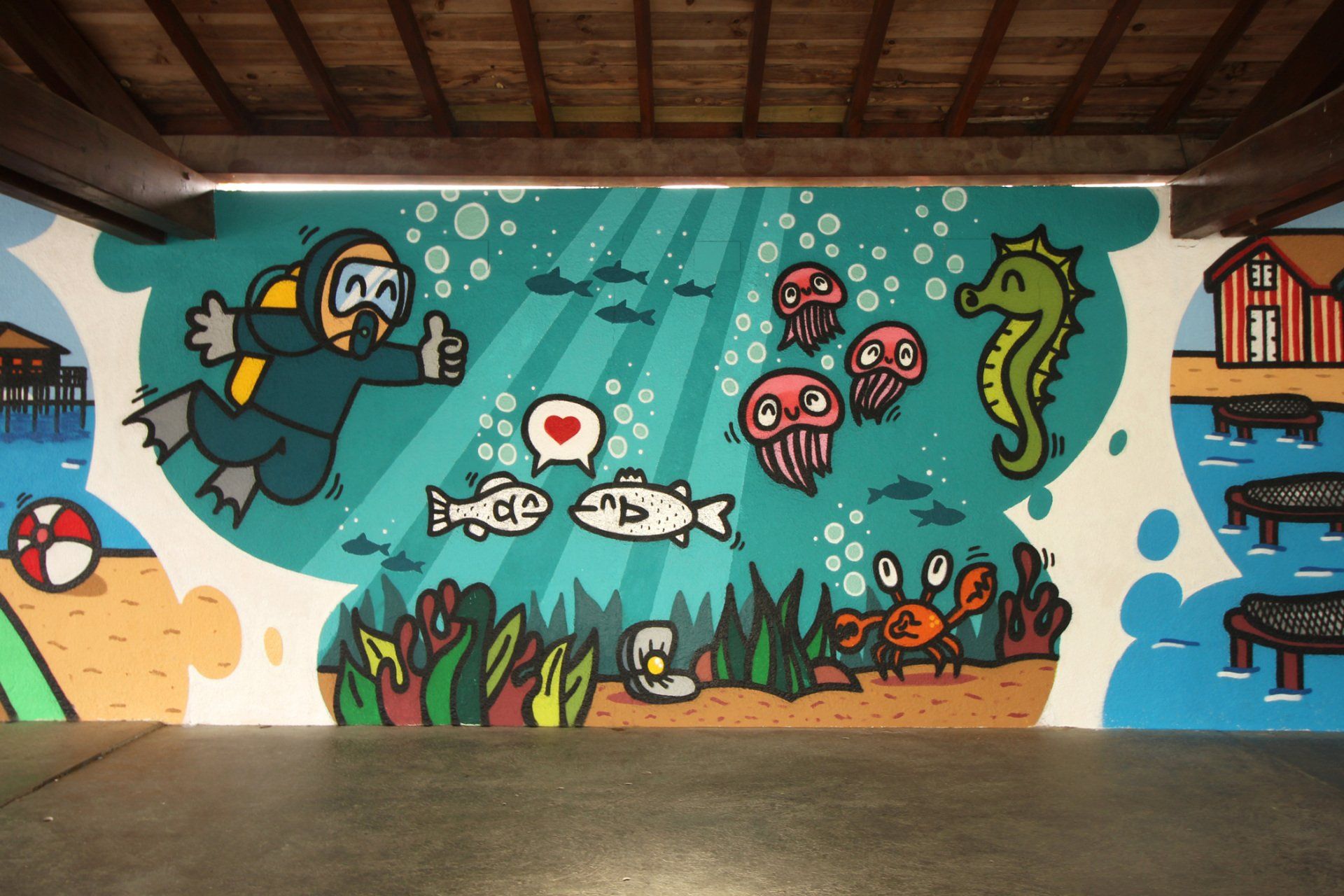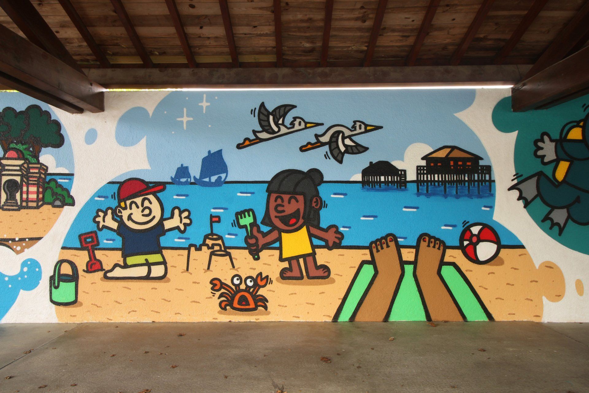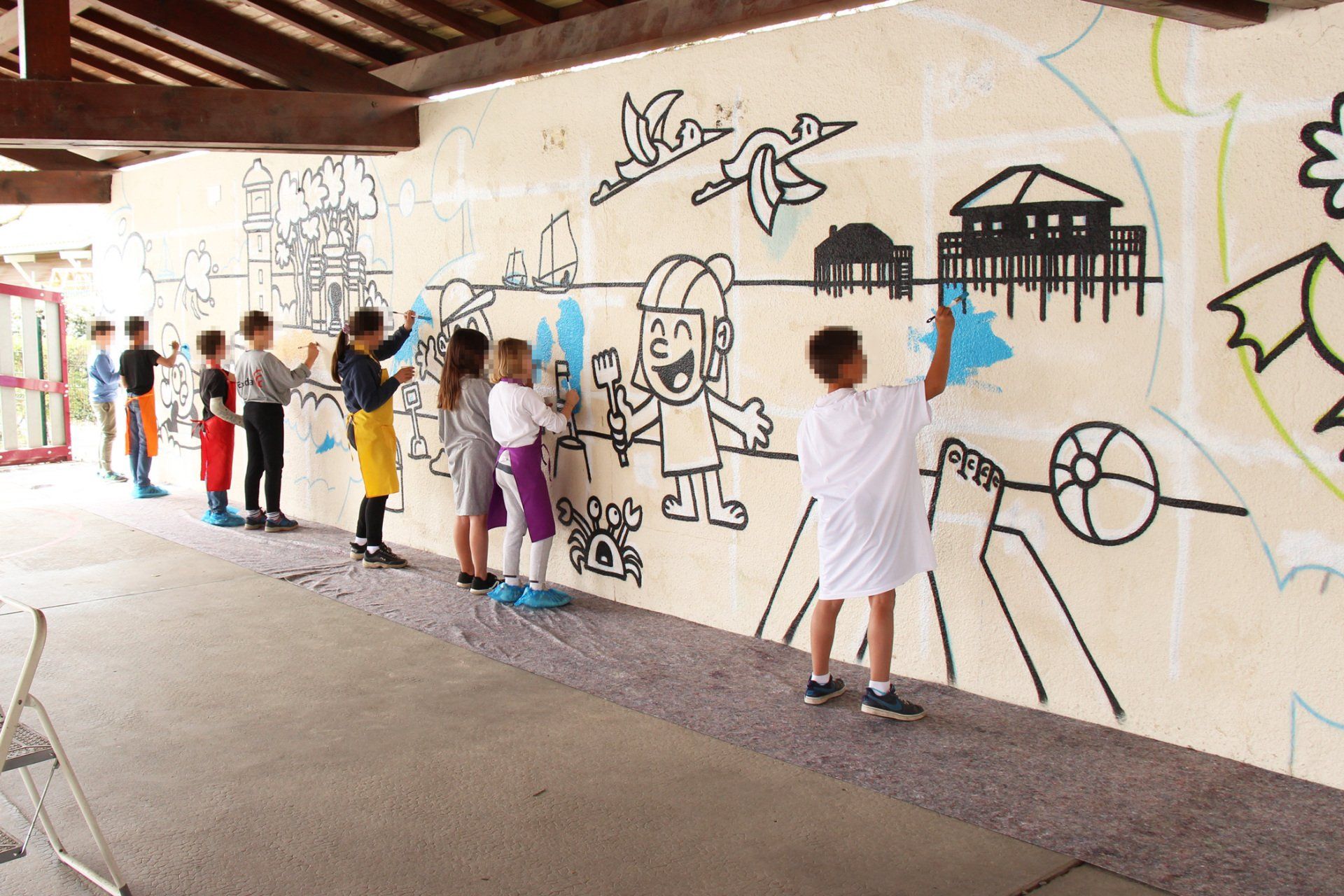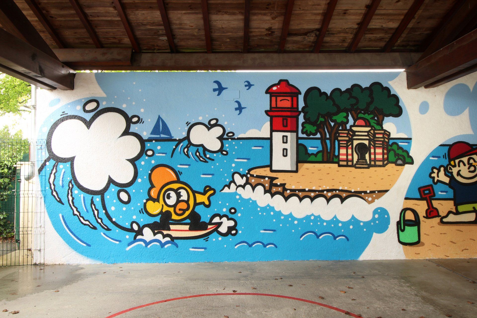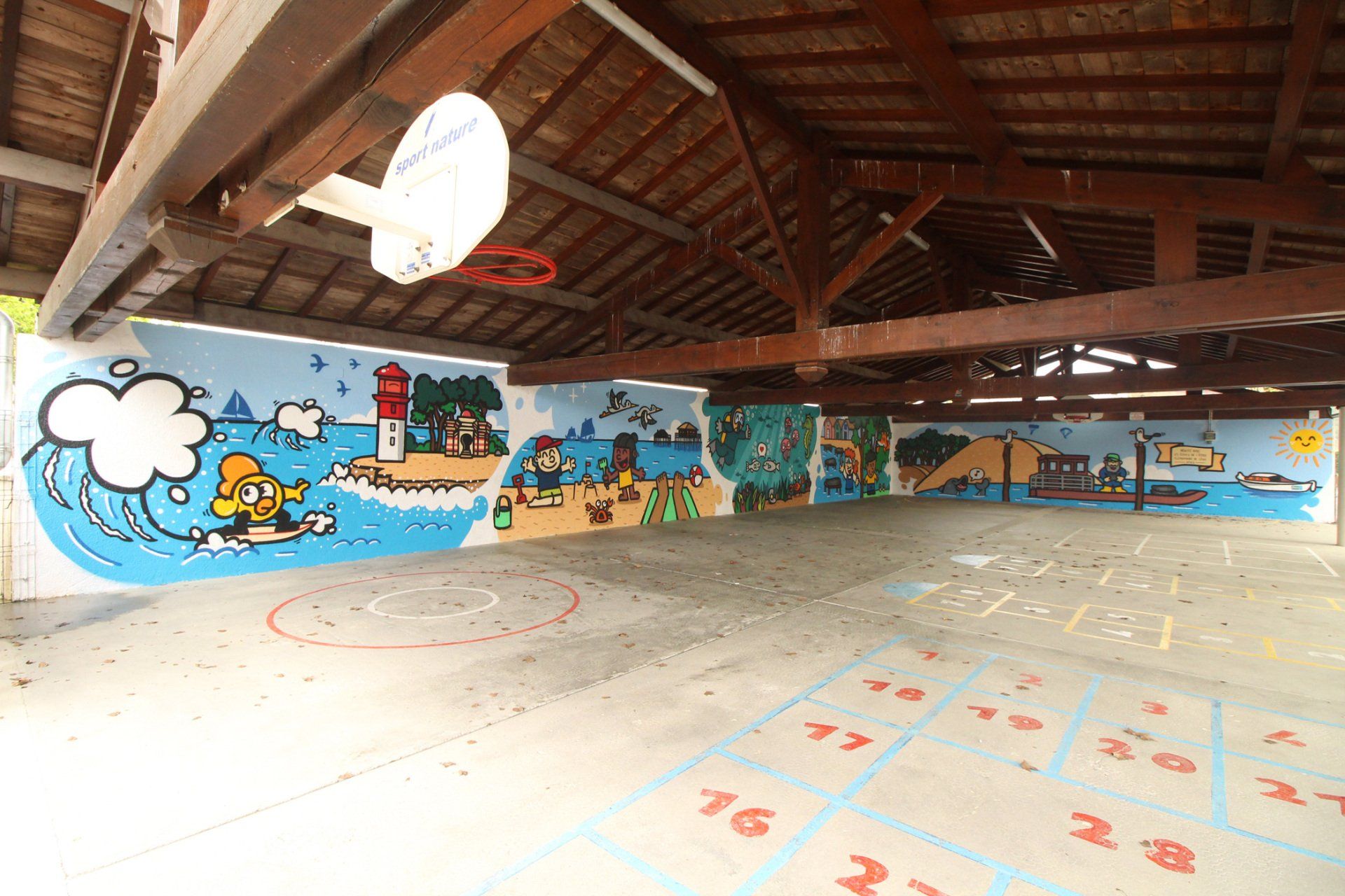 A l'école de Lège-Cap-Ferret, 284 élèves du CP au CM2 ont réalisé cette fresque avec moi. De l'esquisse à la mise en couleur, ils ont toujours été motivés et à fond ! Sur le thème de leur lieu de vie, le Bassin d'Arcachon, nous avons donc peint 30 m de préau, sur un projet qui s'est étalé sur trois mois environ. Merci à la Ville de Lège qui a financé le projet, aux enseignants, à l'Atelier, aux adultes du périscolaire, aux parents et surtout aux enfants qui ont rendu ce projet possible.
