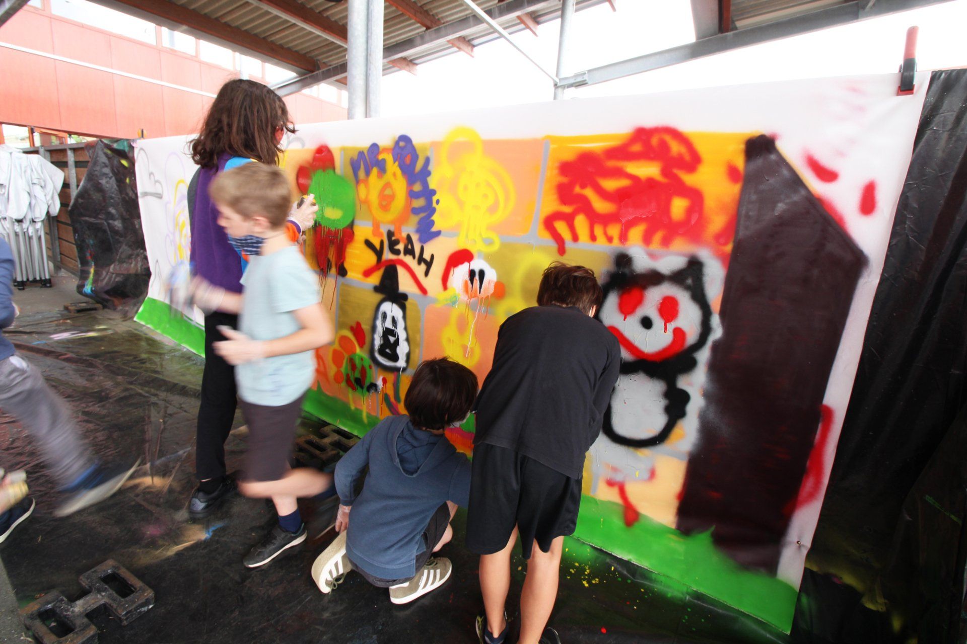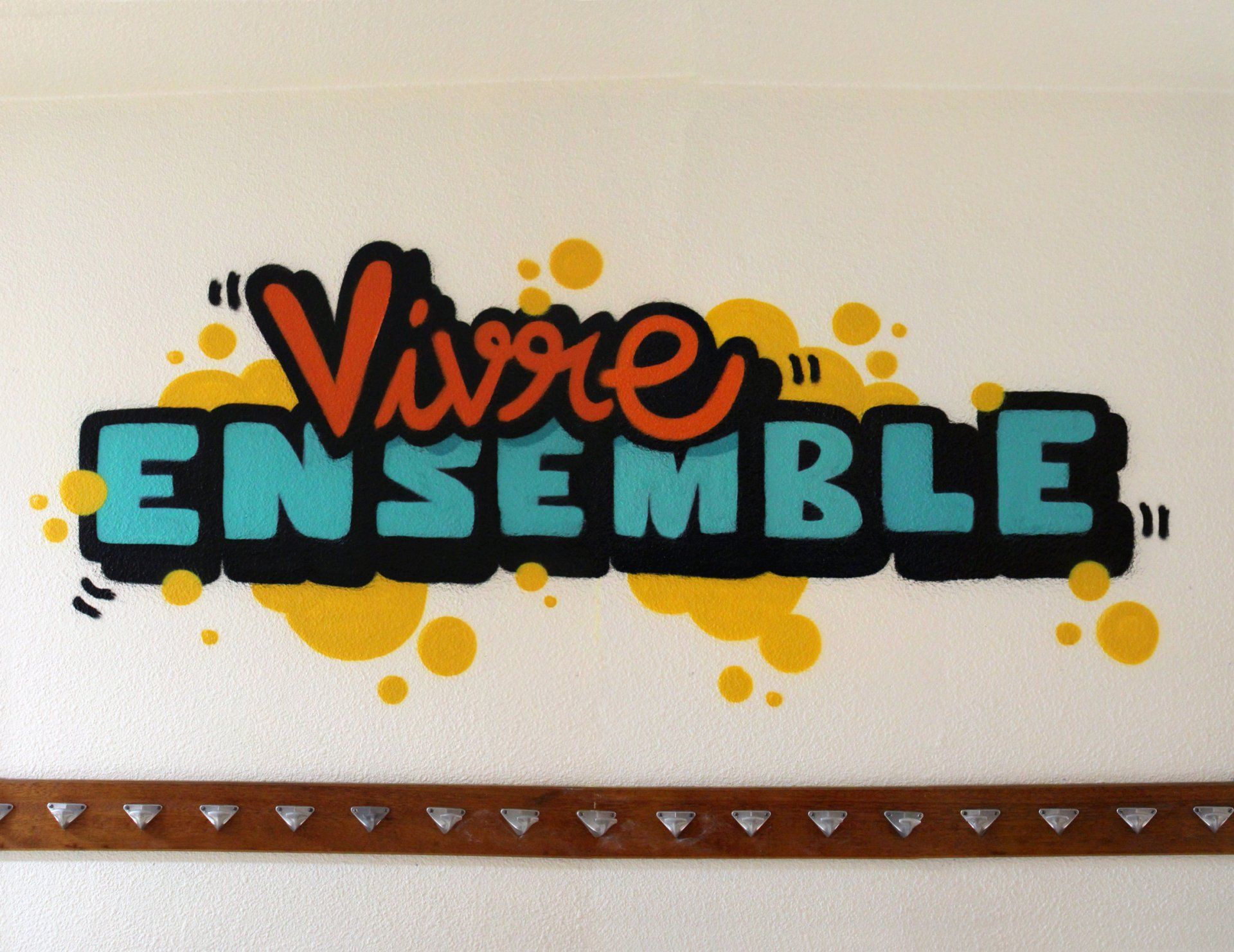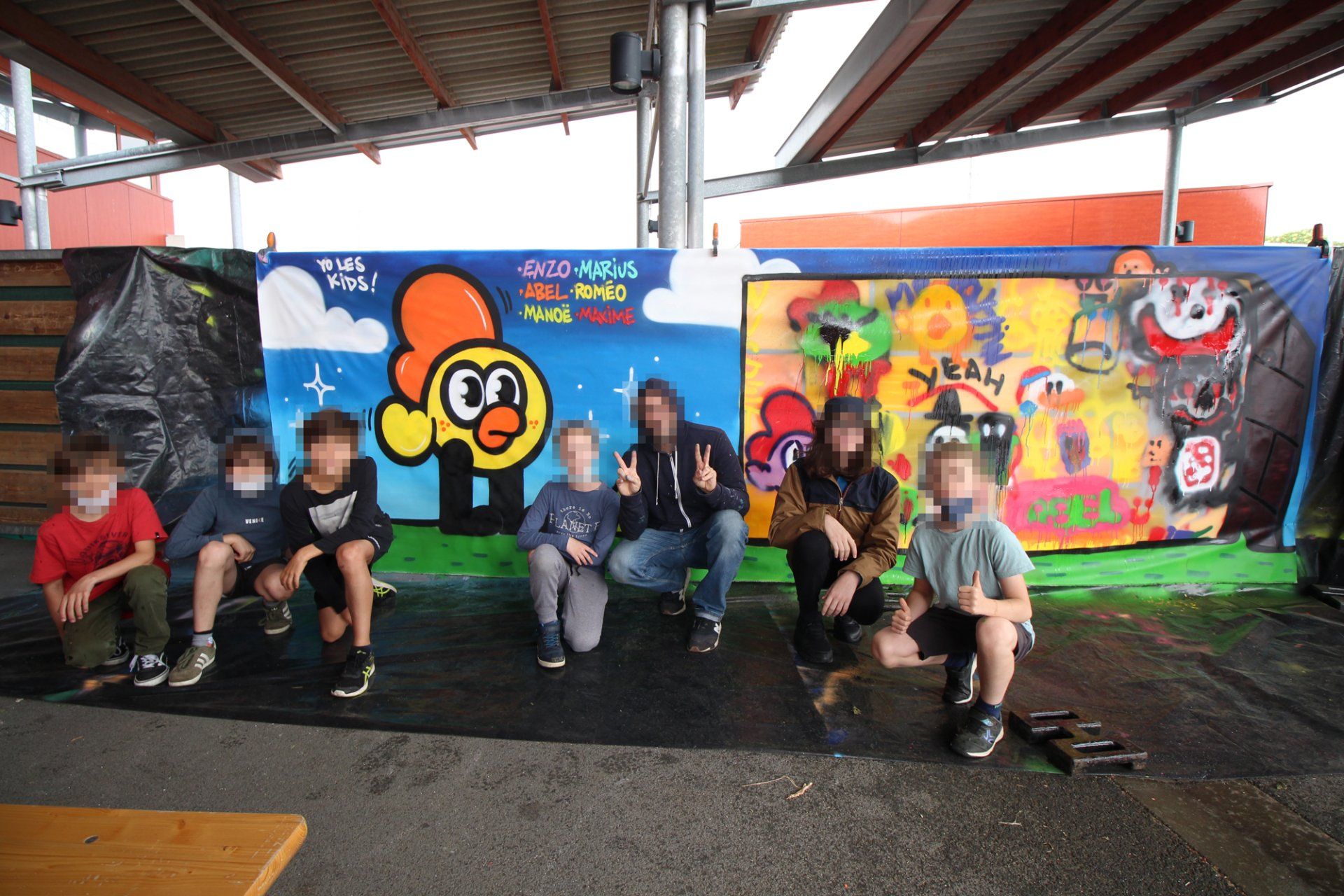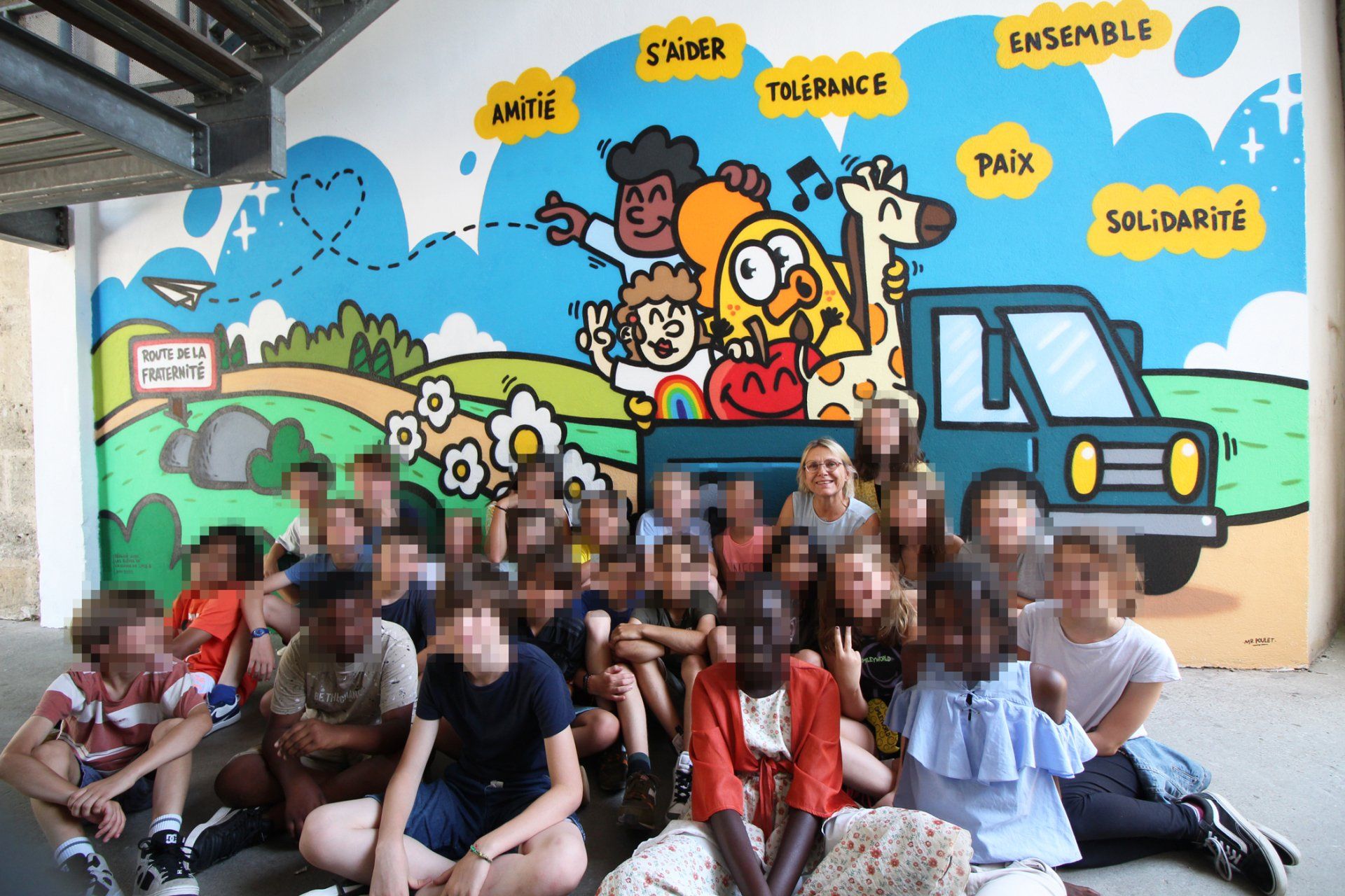 Avec la participation des bienveillantes professionnelles Sylvie et Christelle nous avons, plusieurs journées durant, travaillé dur pour réaliser cette fresque. Et tout ça dans la bonne humeur (et le hip-hop).