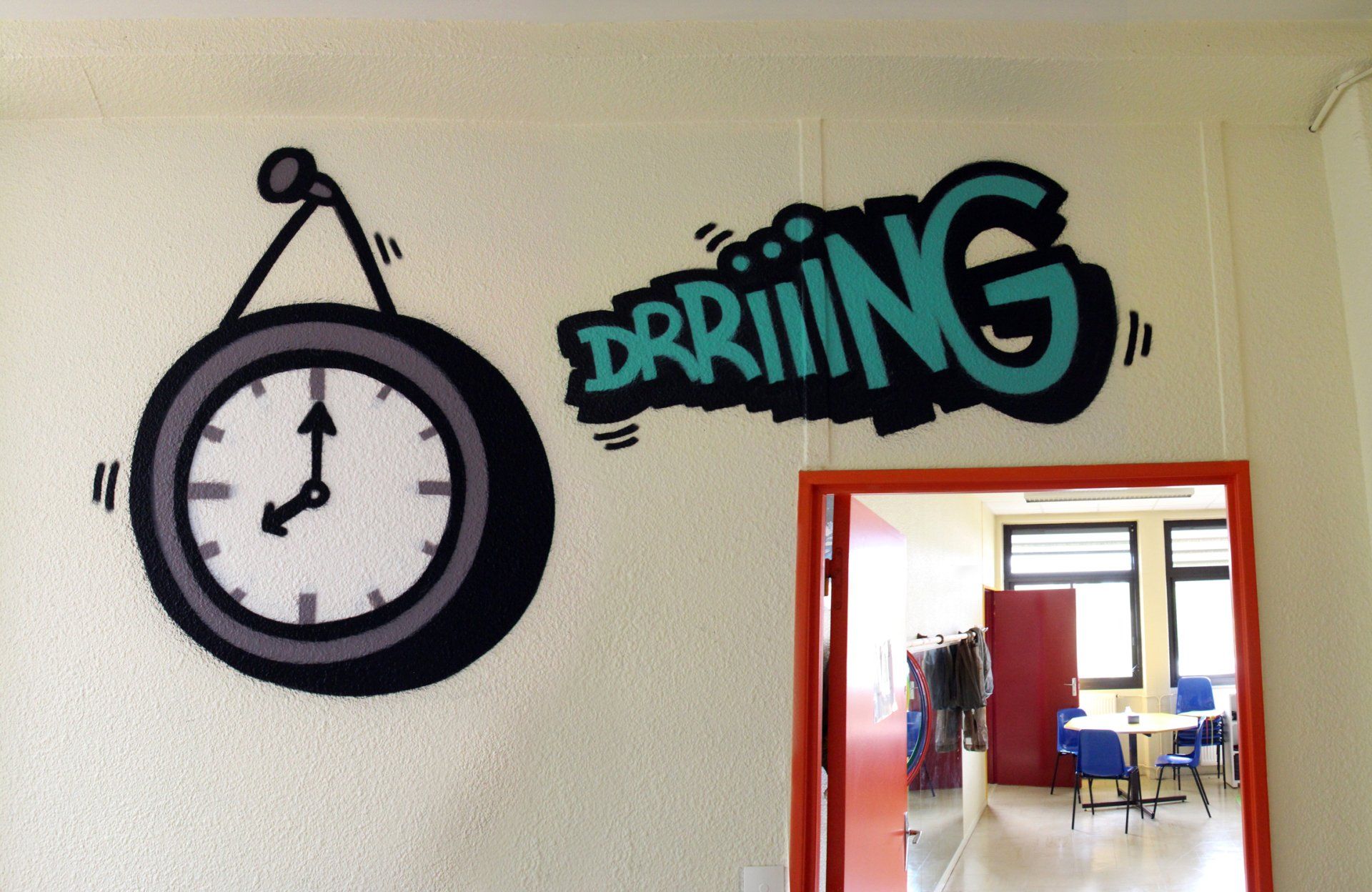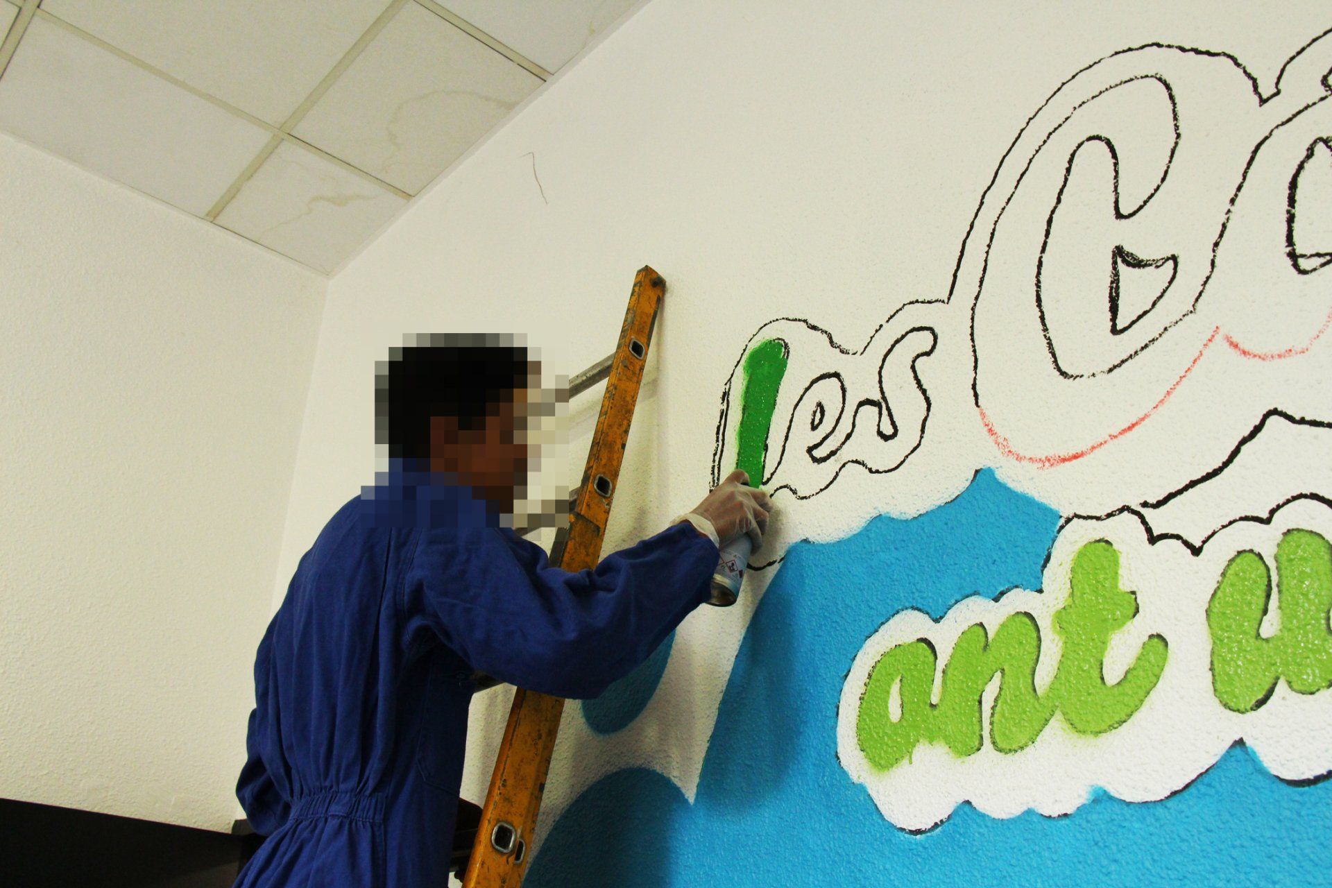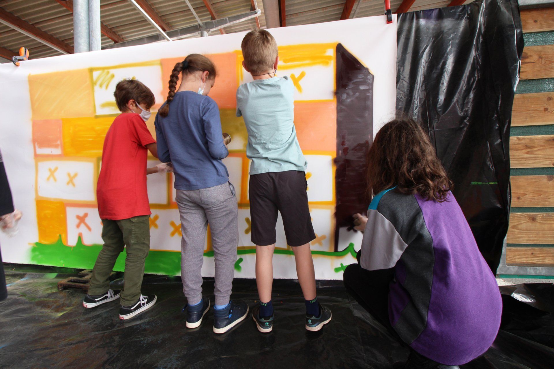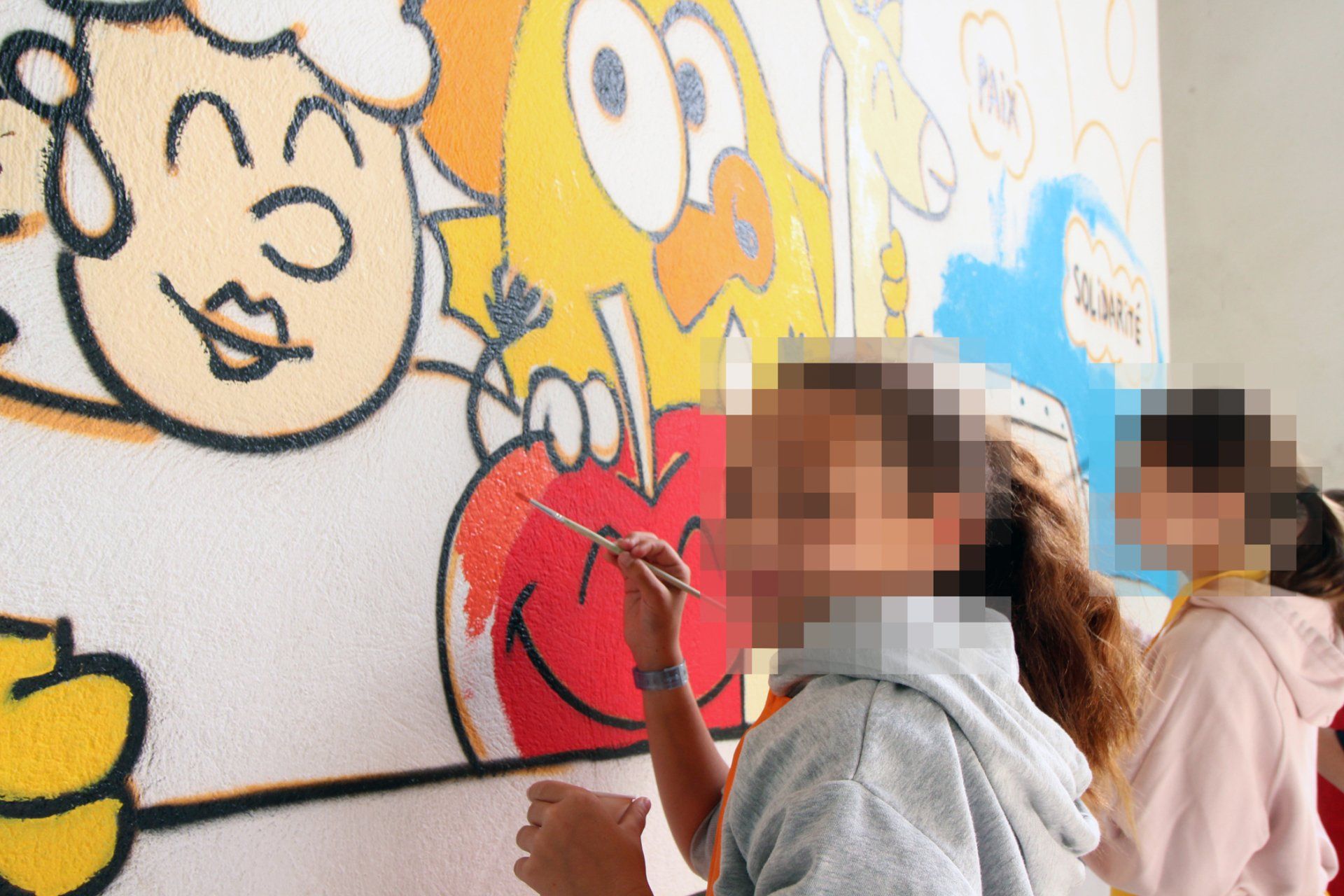 Avec la participation des bienveillantes professionnelles Sylvie et Christelle nous avons, plusieurs journées durant, travaillé dur pour réaliser cette fresque. Et tout ça dans la bonne humeur (et le hip-hop).