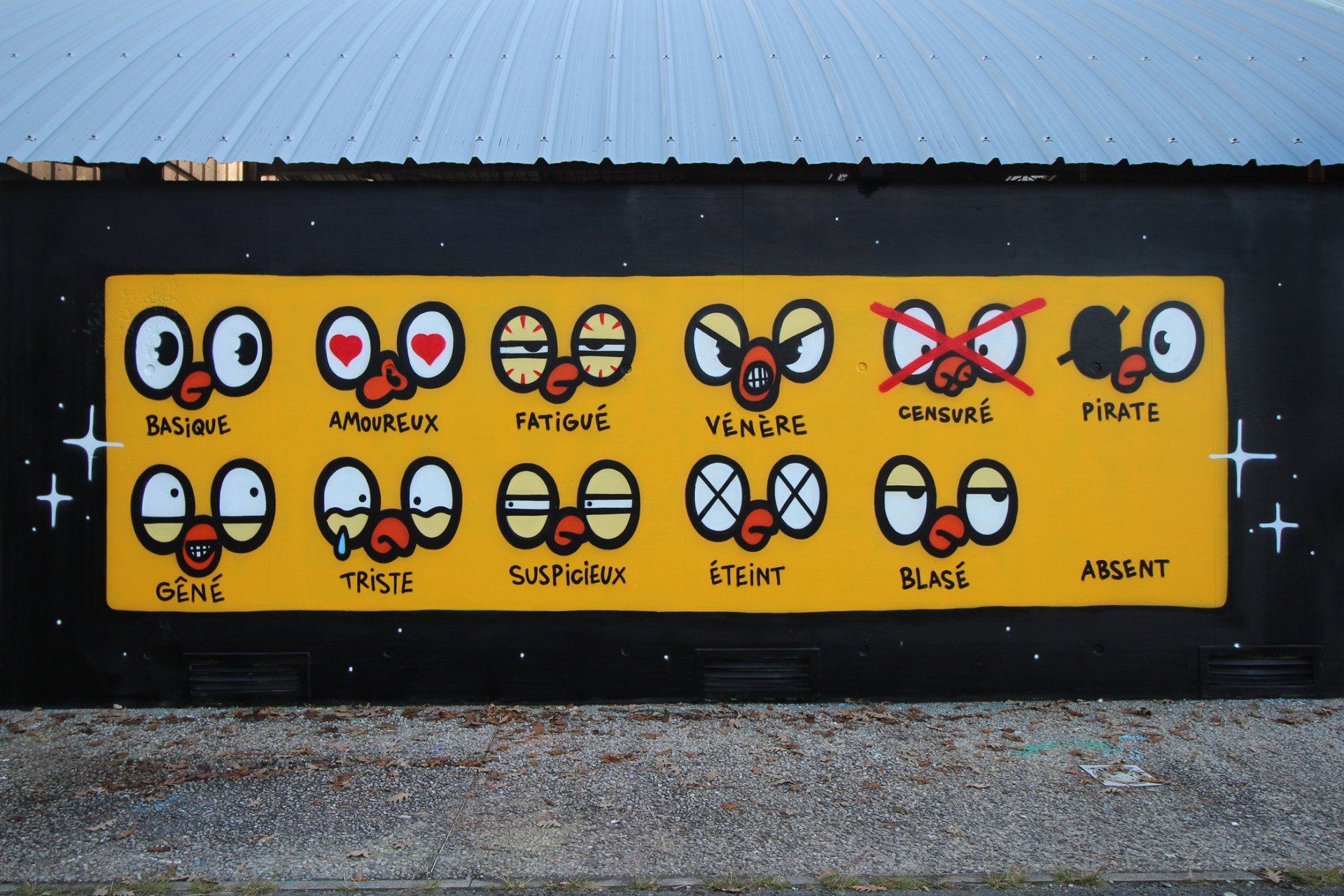Dans ces lieux comme dans d’autres, il met en scène son animal totem dont, avec les années, les traits ont évolué : il a maintenant une forme arrondie et dodue et des couleurs caractéristiques jaune et orange. Cet animal vit ainsi de nombreuses aventures et sa naïveté, ses imperfections, ses maladresses font de lui un personnage enfantin, attachant et attendrissant.