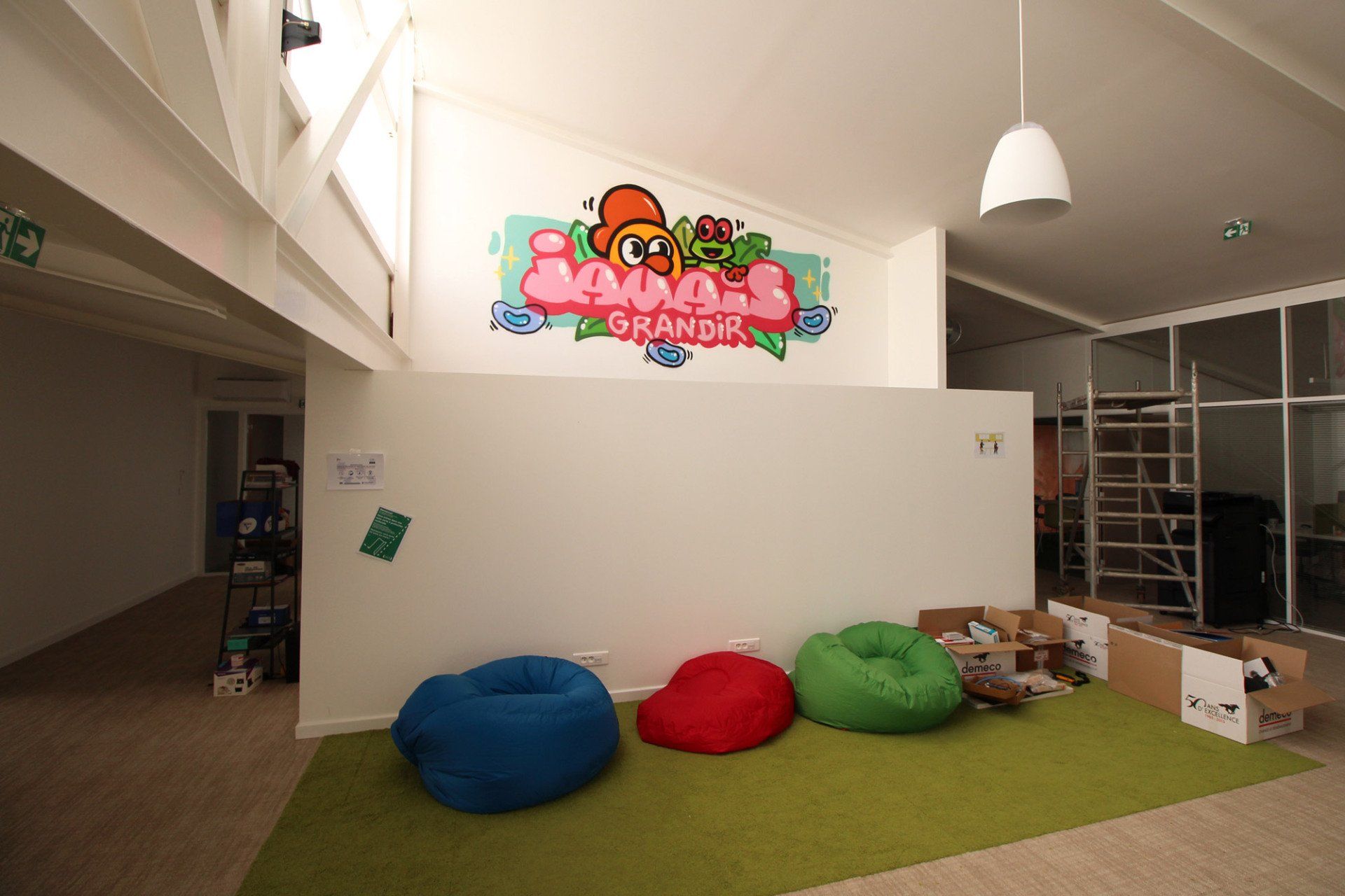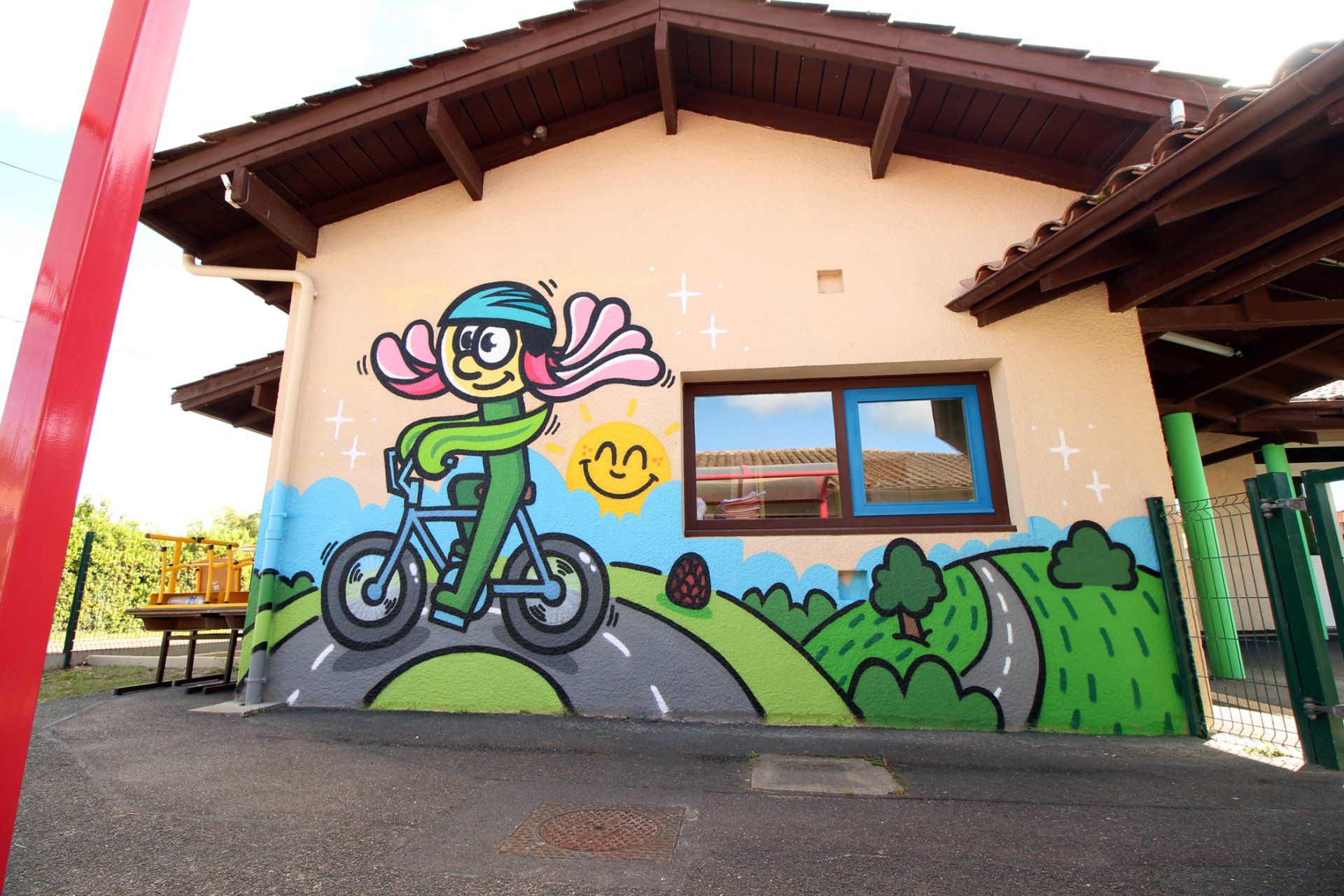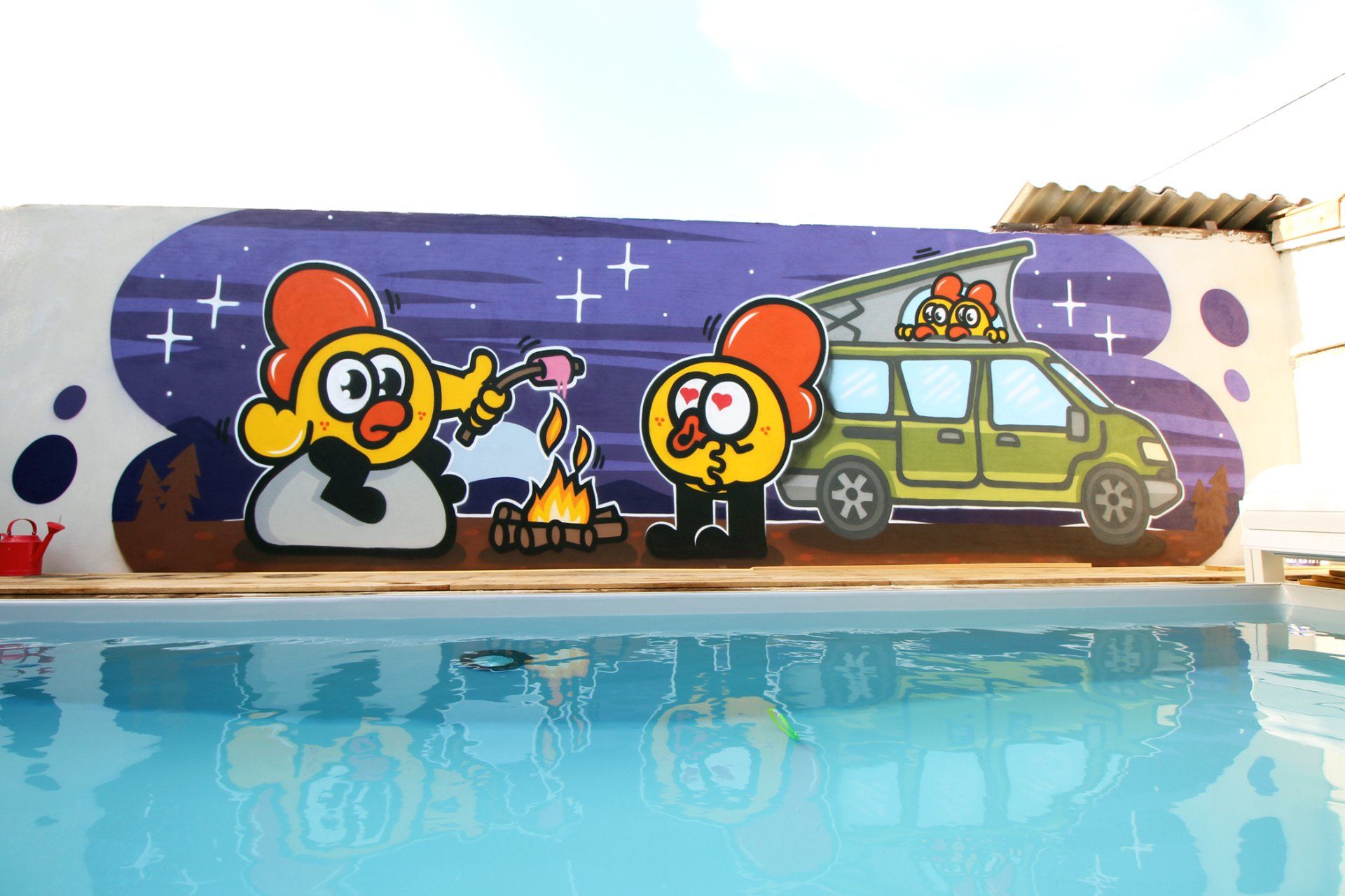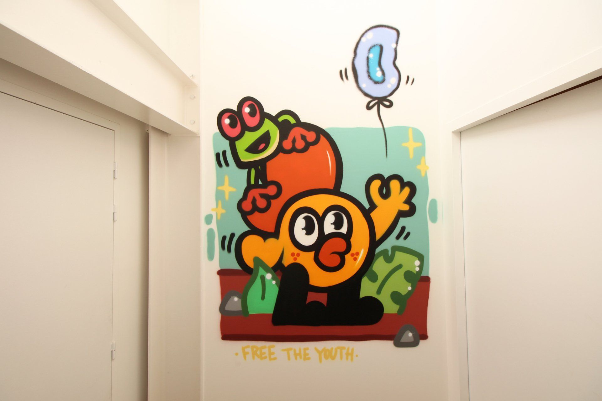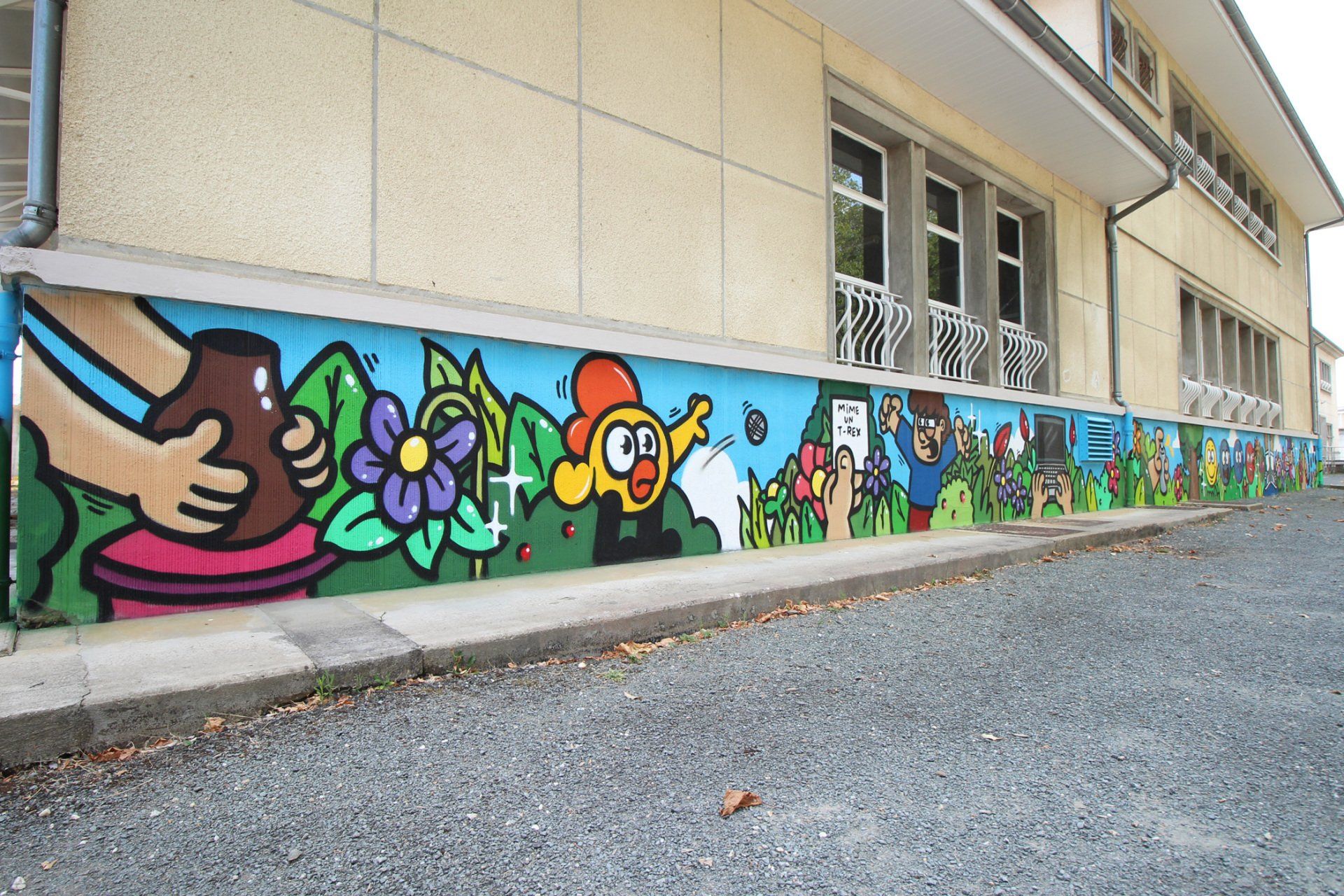 Avec mon acolyte et ami graffeur Manouch, nous avons décoré les murs blancs avec des personnages et des motifs gais et colorés. A leur retour de vacances, les enfants étaient enchantés.